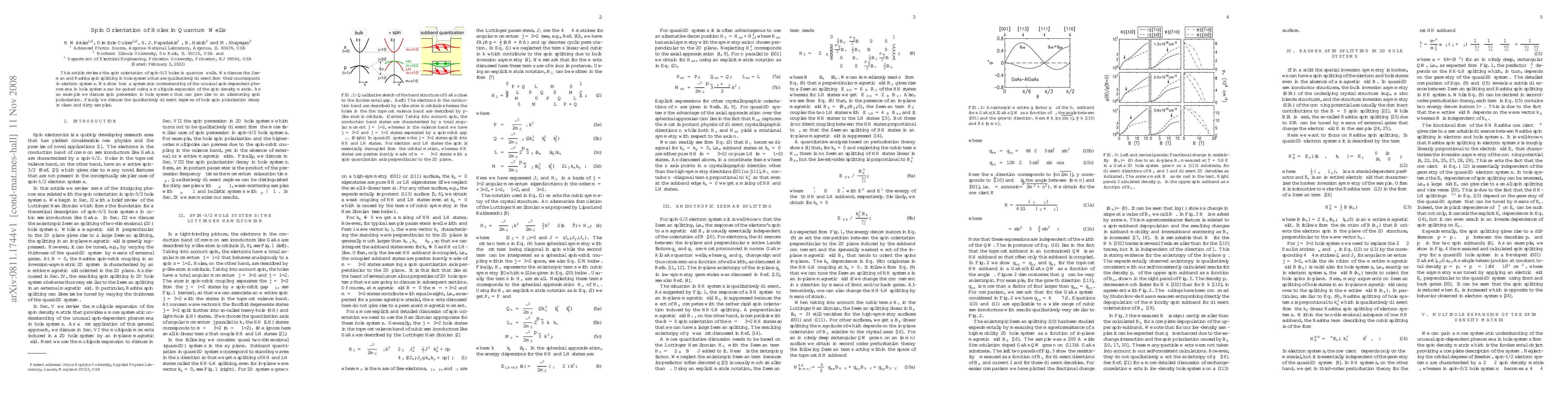 This paper reviews the spin orientation of spin-3/2 holes in quantum wells, focusing on the unique Zeeman and Rashba spin splitting effects compared to electron systems, and explores spin precession phenomena and decay regimes in clean versus dirty samples.