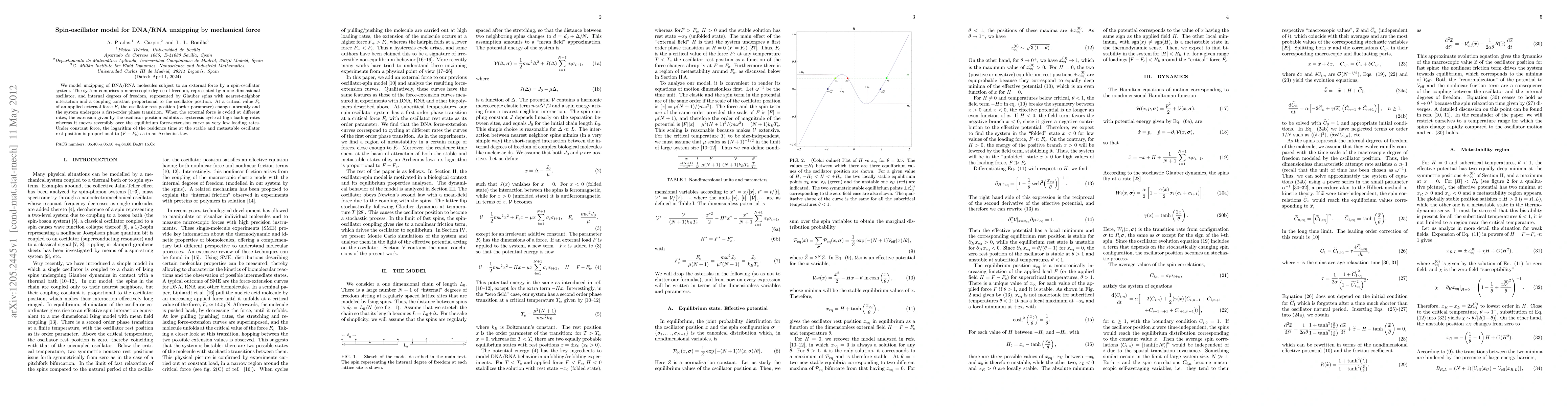 The introduction of a spin-oscillator model that captures the essential physics of DNA/RNA unzipping under mechanical force, providing insights into phase transitions and hysteresis behavior.