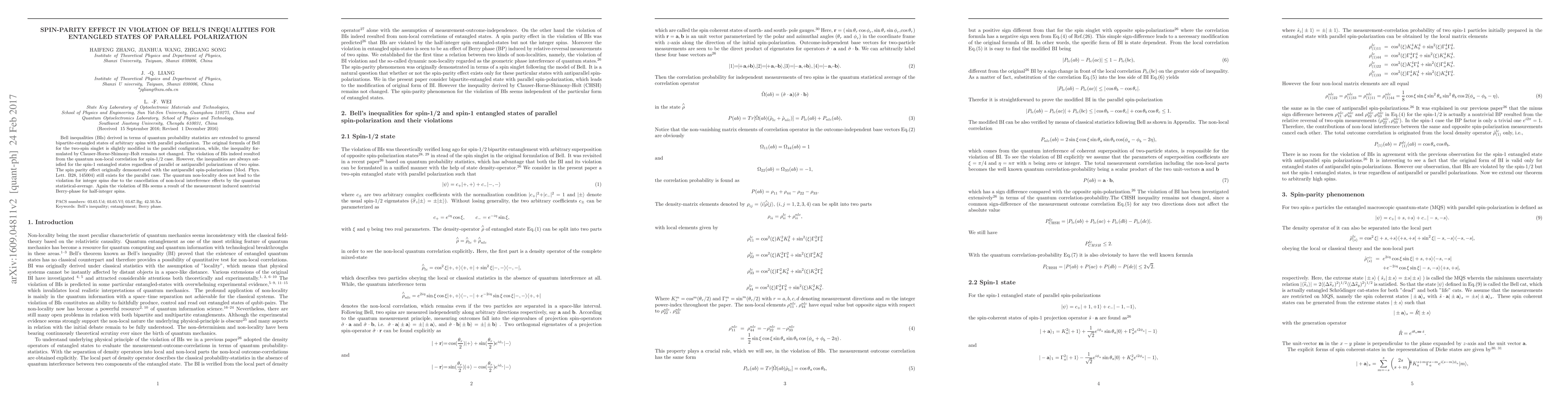 Bell inequalities (BIs) derived in terms of quantum probability statistics are extended to general bipartite-entangled states of arbitrary spins with parallel polarization. The original formula of Bell for the two-spin singlet is slightly modified in the parallel configuration, while, the inequality for- mulated by Clauser-Horne-Shimony-Holt remains not changed. The violation of BIs indeed resulted from the quantum non-local correlation for spin-1=2 case. However, the inequalities are always satisfied for the spin-1 entangled states regardless of parallel or antiparallel polarizations of two spins. The spin parity effect originally demonstrated with the antiparallel spin-polarizations (Mod. Phys. Lett. B28, 145004) still exists for the parallel case. The quantum non-locality does not lead to the violation for integer spins due to the cancellation of non-local interference effects by the quantum statistical-average. Again the violation of BIs seems a result of the measurement induced nontrivial Berry-phase for half-integer spins.