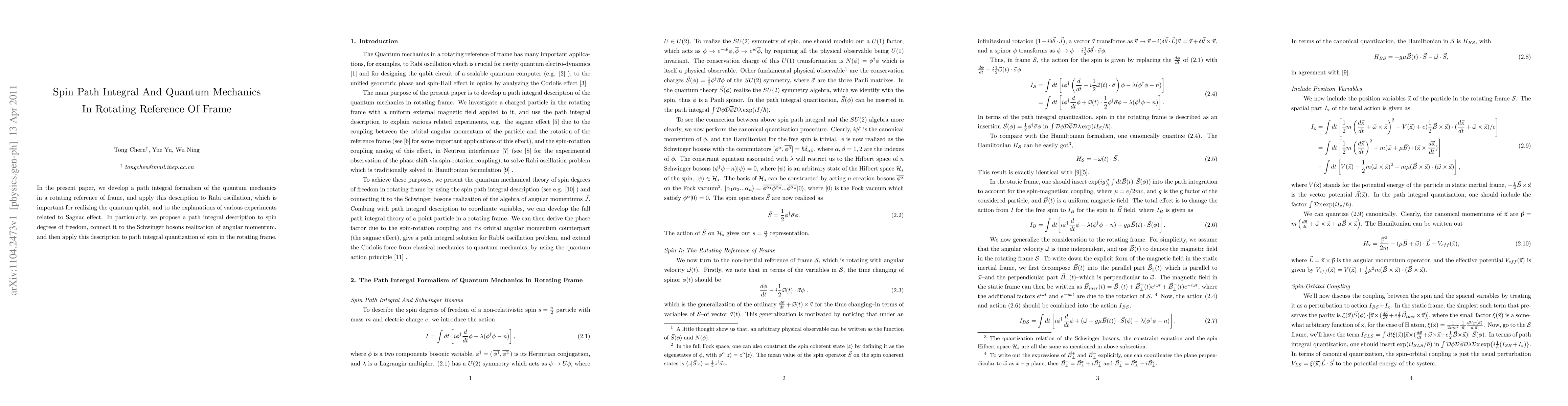 This paper introduces a path integral formalism for quantum mechanics in a rotating reference frame and proposes a spin path integral approach for spin degrees of freedom. It also provides examples demonstrating the applications of the developed formalism.