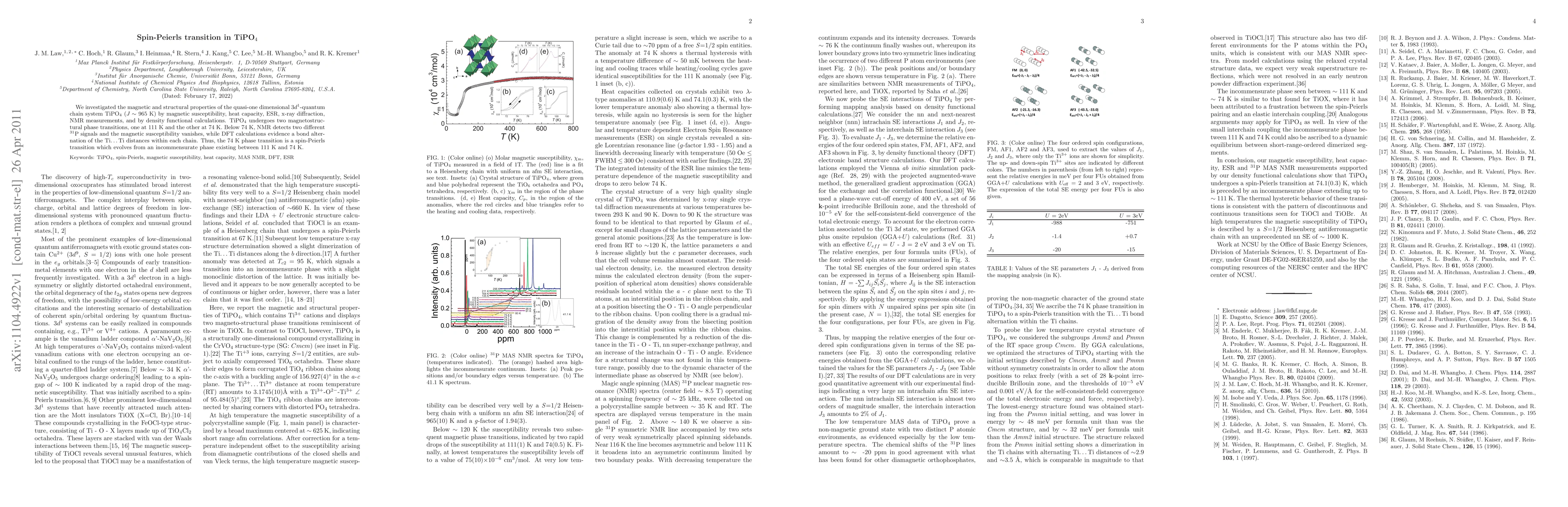 We investigated the magnetic and structural properties of the quasi-one dimensional 3$d^1$-quantum chain system TiPO$_4$ ($J \sim$ 965 K) by magnetic susceptibility, heat capacity, ESR, x-ray diffraction, NMR measurements, and by density functional calculations. TiPO$_4$ undergoes two magnetostructural phase transitions, one at 111 K and the other at 74 K. Below 74 K, NMR detects two different $^{31}$P signals and the magnetic susceptibility vanishes, while DFT calculations evidence a bond alternation of the Ti...Ti distances within each chain. Thus, the 74 K phase transition is a spin-Peierls transition which evolves from an incommensurate phase existing between 111 K and 74 K.