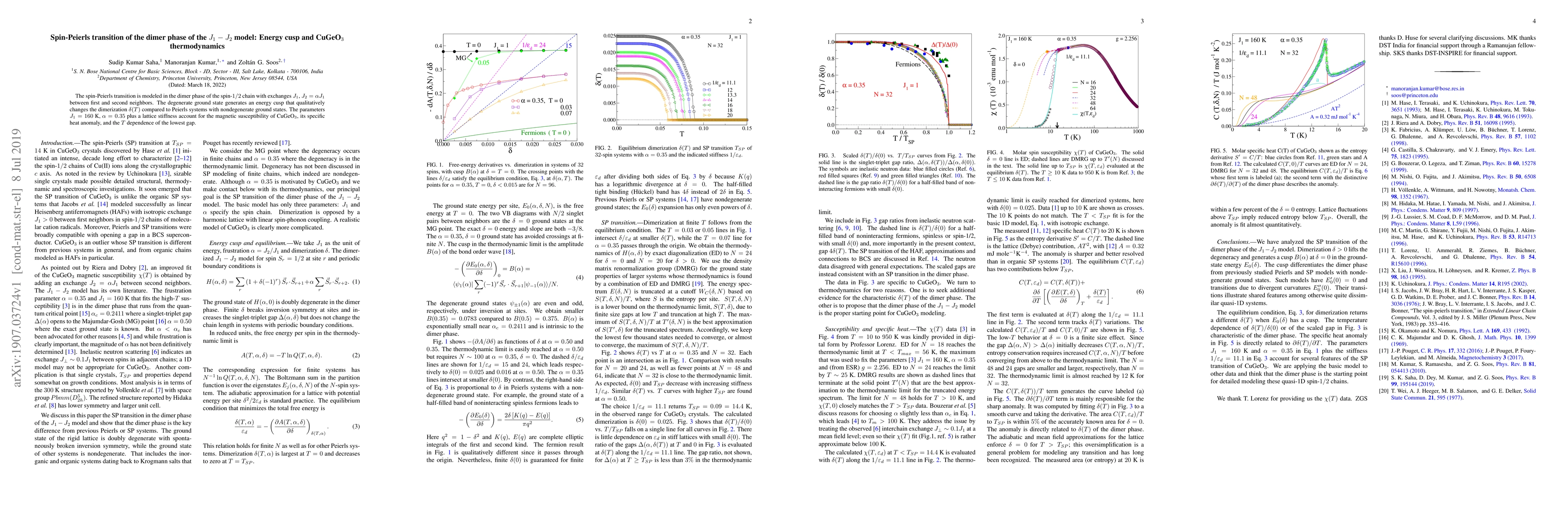 This paper models the spin-Peierls transition in the dimer phase of a spin-$1/2$ chain, showing that a degenerate ground state leads to a unique energy cusp affecting dimerization. The parameters derived for the $J_1-J_2$ model accurately describe the magnetic susceptibility, specific heat anomaly, and temperature dependence of the lowest gap in CuGeO$_3$.