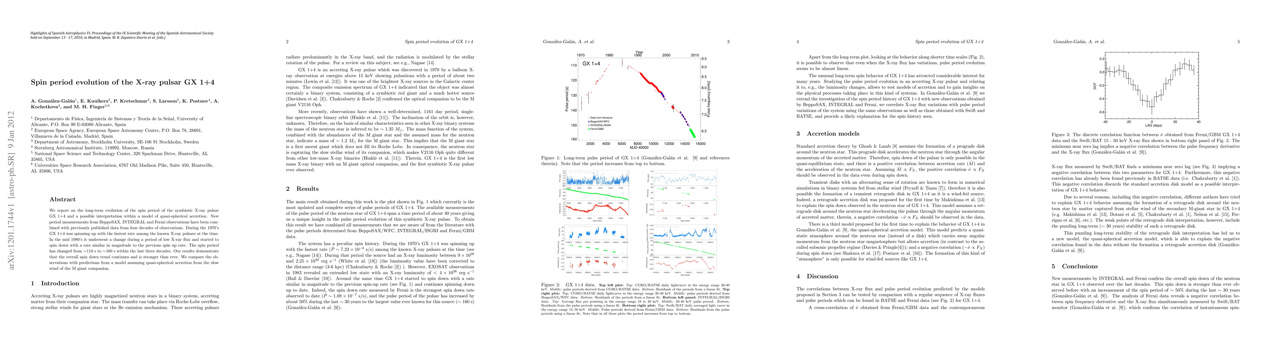This paper reports on the long-term spin period evolution of the X-ray pulsar GX 1+4, showing a transition from rapid spin-up in the 1970s to spin-down in the 1980s, with the spin period increasing from ~110 s to ~160 s over three decades. The observed trend aligns with predictions from a quasi-spherical accretion model from the M giant companion.