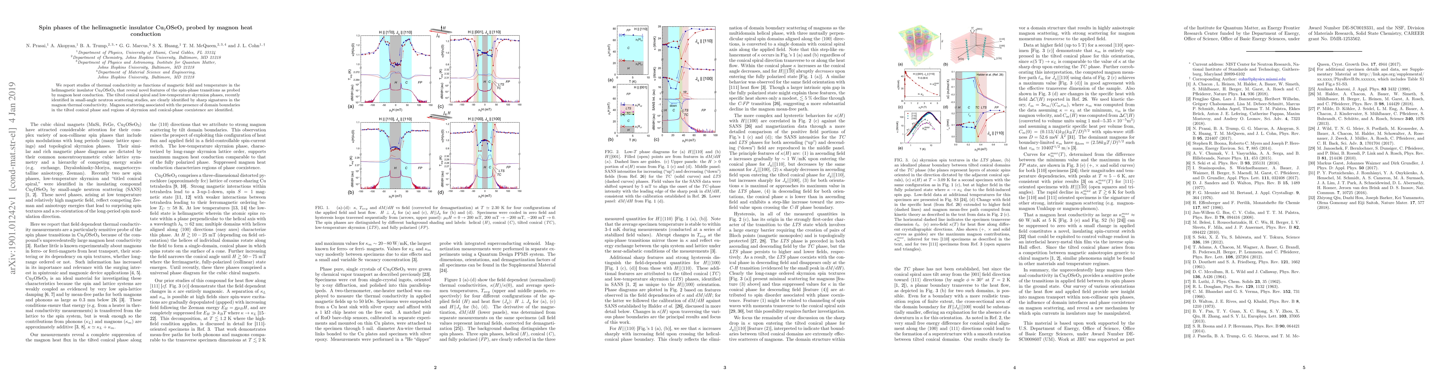 This study investigates the thermal conductivity of the helimagnetic insulator Cu$_2$OSeO$_3$ to reveal spin-phase transitions, identifying the tilted conical spiral and skyrmion phases through magnon heat conduction. Sharp signatures in magnon thermal conductivity indicate domain boundary scattering and regions of phase coexistence.
