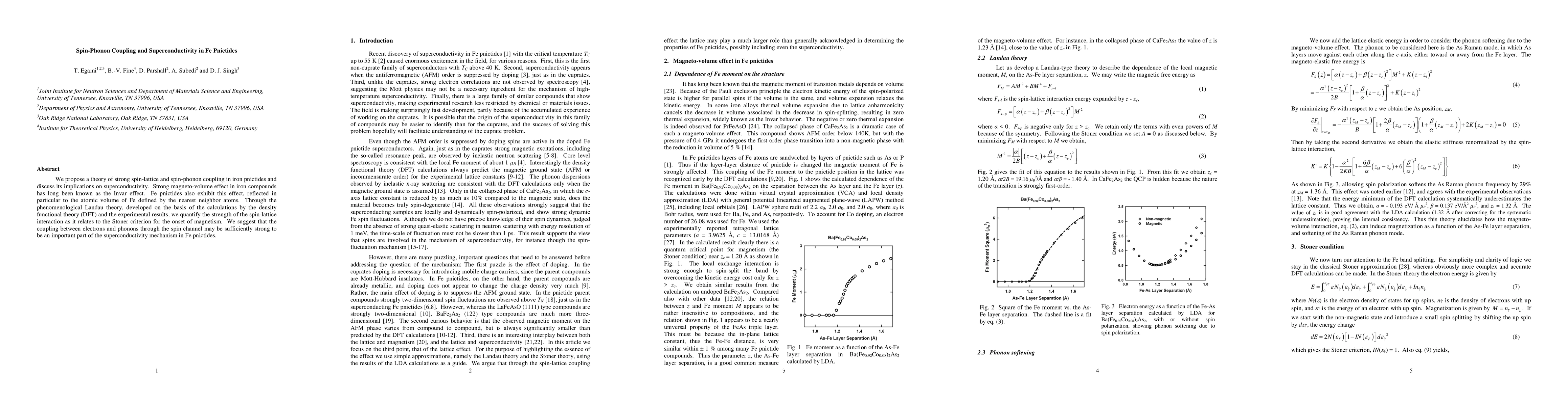 We propose a theory of strong spin-lattice and spin-phonon coupling in iron pnictides and discuss its implications on superconductivity. Strong magneto-volume effect in iron compounds has long been known as the Invar effect. Fe pnictides also exhibit this effect, reflected in particular to the atomic volume of Fe defined by the nearest neighbor atoms. Through the phenomenological Landau theory, developed on the basis of the calculations by the density functional theory (DFT) and the experimental results, we quantify the strength of the spin-lattice interaction as it relates to the Stoner criterion for the onset of magnetism. We suggest that the coupling between electrons and phonons through the spin channel may be sufficiently strong to be an important part of the superconductivity mechanism in Fe pnictides.