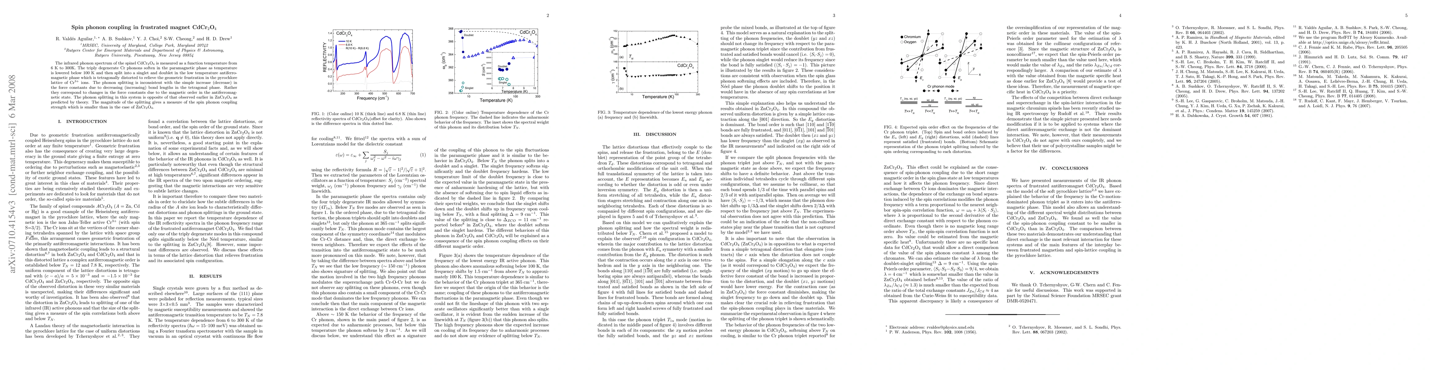 This study investigates the spin phonon coupling in CdCr$_2$O$_4$, revealing that Cr phonons soften and split into a singlet and doublet in the low-temperature antiferromagnetic phase due to magnetic order, rather than simple bond length changes. The observed phonon splitting indicates a weaker spin phonon coupling compared to ZnCr$_2$O$_4$.