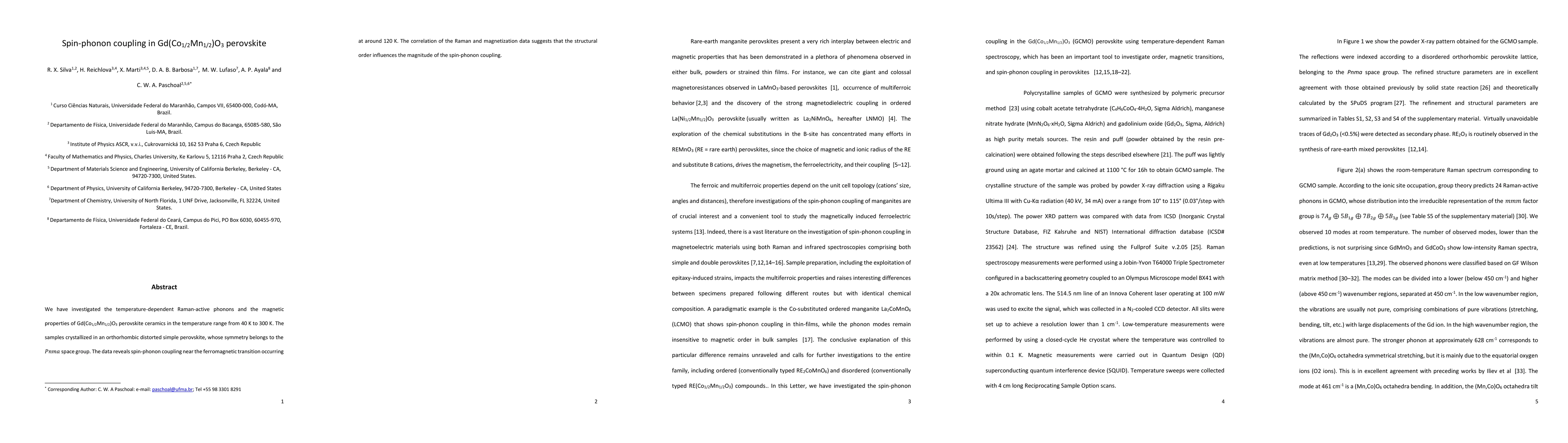 This study investigates the spin-phonon coupling in Gd(Co1/2Mn1/2)O3 perovskite ceramics over a temperature range from 40 K to 300 K, revealing significant coupling near the ferromagnetic transition at 120 K, influenced by structural order.