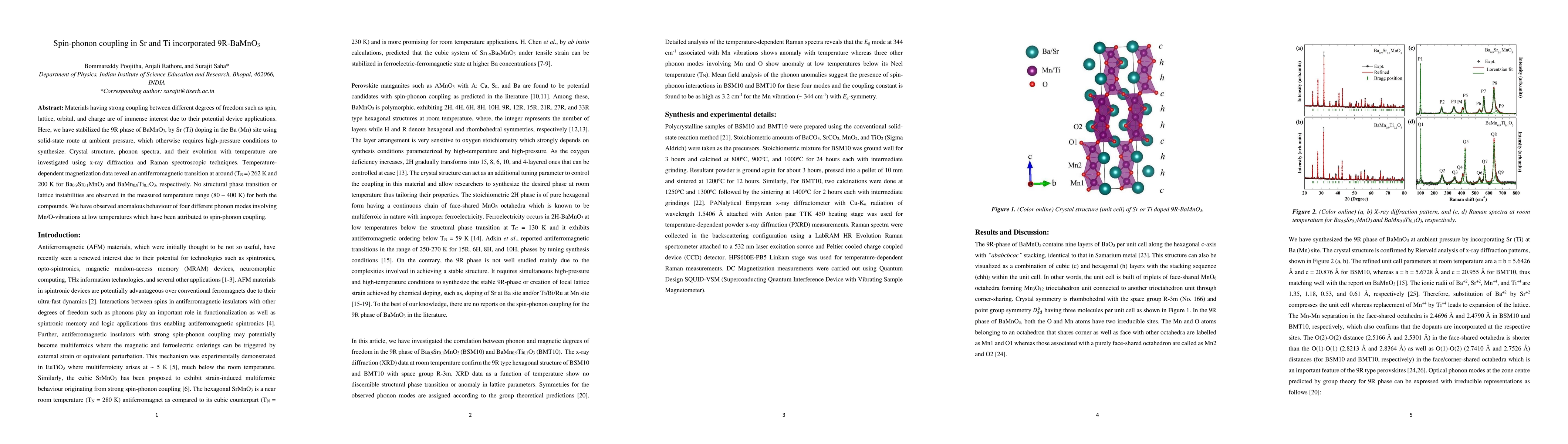 This paper investigates Sr and Ti doping in 9R-BaMnO3 to stabilize its phase at ambient pressure, revealing strong spin-phonon coupling through temperature-dependent magnetization and phonon spectroscopic studies. Anomalous phonon behavior at low temperatures indicates significant interactions between spin and lattice dynamics.