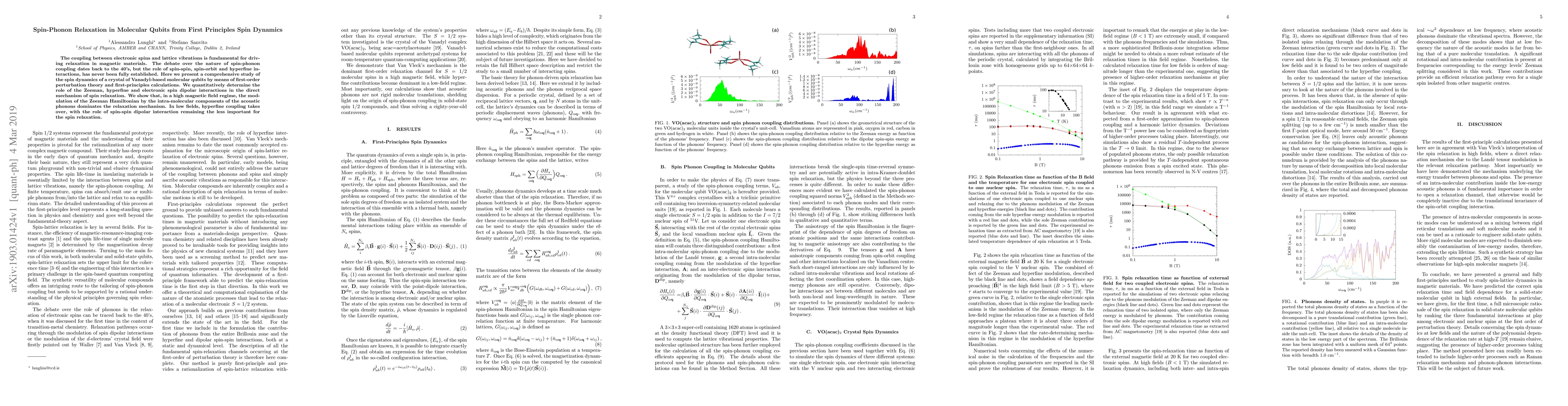The coupling between electronic spins and lattice vibrations is fundamental for driving relaxation in magnetic materials. The debate over the nature of spin-phonon coupling dates back to the 40's, but the role of spin-spin, spin-orbit and hyperfine interactions, has never been fully established. Here we present a comprehensive study of the spin dynamics of a crystal of Vanadyl-based molecular qubits by means of first-order perturbation theory and first-principles calculations. We quantitatively determine the role of the Zeeman, hyperfine and electronic spin dipolar interactions in the direct mechanism of spin relaxation. We show that, in a high magnetic field regime, the modulation of the Zeeman Hamiltonian by the intra-molecular components of the acoustic phonons dominates the relaxation mechanism. In low fields, hyperfine coupling takes over, with the role of spin-spin dipolar interaction remaining the less important for the spin relaxation.