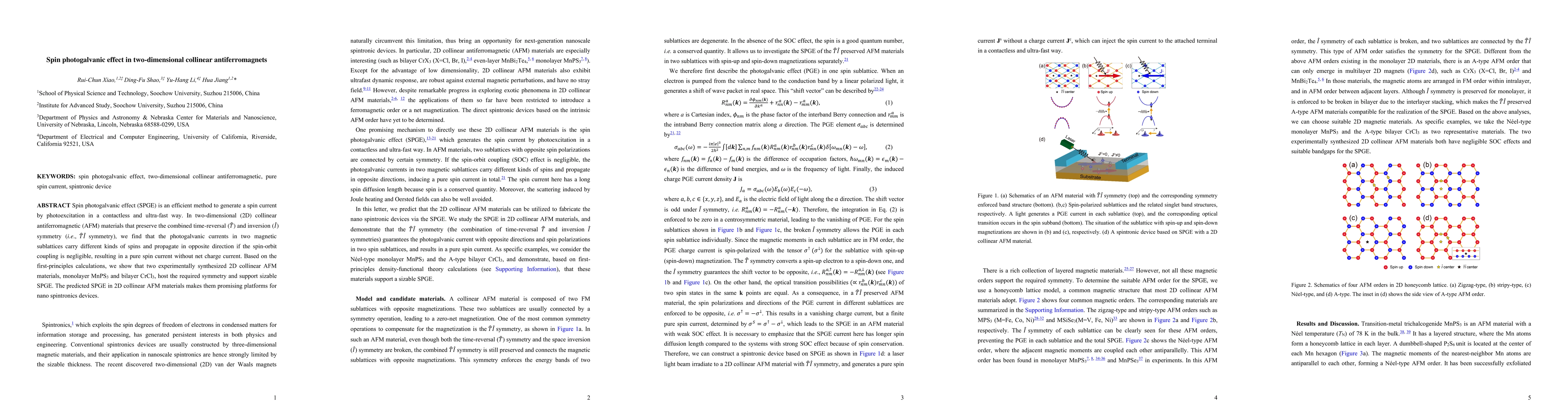 The paper investigates the spin photogalvanic effect (SPGE) in two-dimensional collinear antiferromagnets, revealing that these materials can generate pure spin currents via photoexcitation without net charge currents. First-principles calculations demonstrate that monolayer MnPS$_3$ and bilayer CrCl$_3$ exhibit significant SPGE, positioning them as promising candidates for nano spintronics applications.