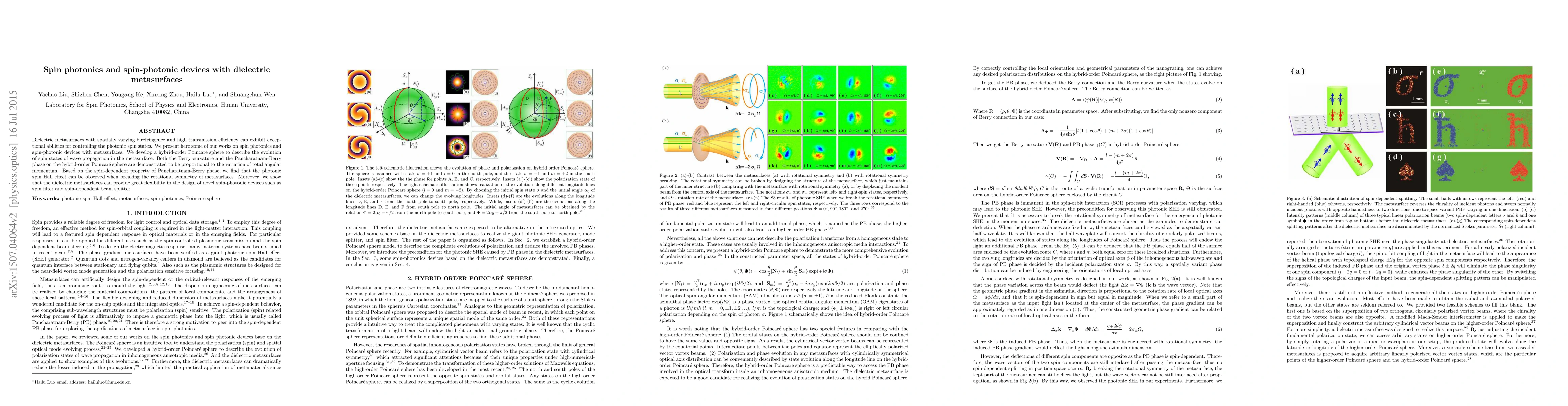 Dielectric metasurfaces with spatially varying birefringence and high transmission efficiency can exhibit exceptional abilities for controlling the photonic spin states. We present here some of our works on spin photonics and spin-photonic devices with metasurfaces. We develop a hybrid-order Poincare sphere to describe the evolution of spin states of wave propagation in the metasurface. Both the Berry curvature and the Pancharatnam-Berry phase on the hybrid-order Poincare sphere are demonstrated to be proportional to the variation of total angular momentum. Based on the spin-dependent property of Pancharatnam-Berry phase, we find that the photonic spin Hall effect can be observed when breaking the rotational symmetry of metasurfaces. Moreover, we show that the dielectric metasurfaces can provide great flexibility in the design of novel spin-photonic devices such as spin filter and spin-dependent beam splitter.