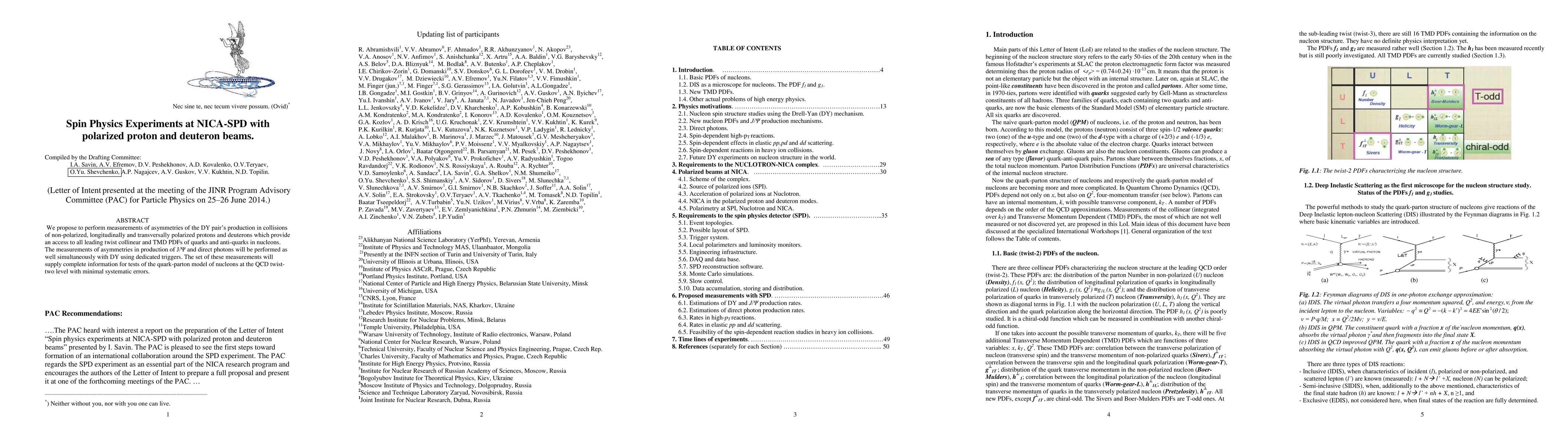 We propose to perform measurements of asymmetries of the Drell-Yan (DY) pairs production in collisions of non-polarized, longitudinally and transversally polarized protons and deuterons which provide an access to all leading twist collinear and TMD PDFs of quarks and anti-quarks in nucleons. The measurements of asymmetries in production of J/\Psi and direct photons will be performed as well simultaneously with DY using dedicated triggers. The set of these measurements will supply complete information for tests of the quark-parton model of nucleons at the QCD twist-two level with minimal systematic errors.
