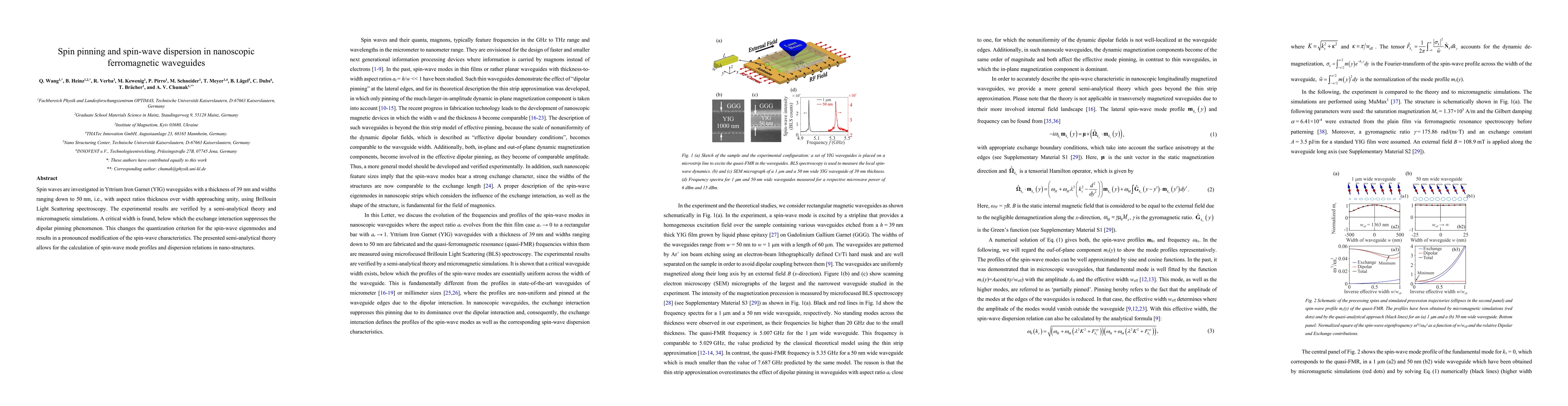 Researchers studied spin waves in tiny Yttrium Iron Garnet waveguides and found a critical width below which exchange interaction suppresses dipolar pinning, altering spin-wave characteristics.