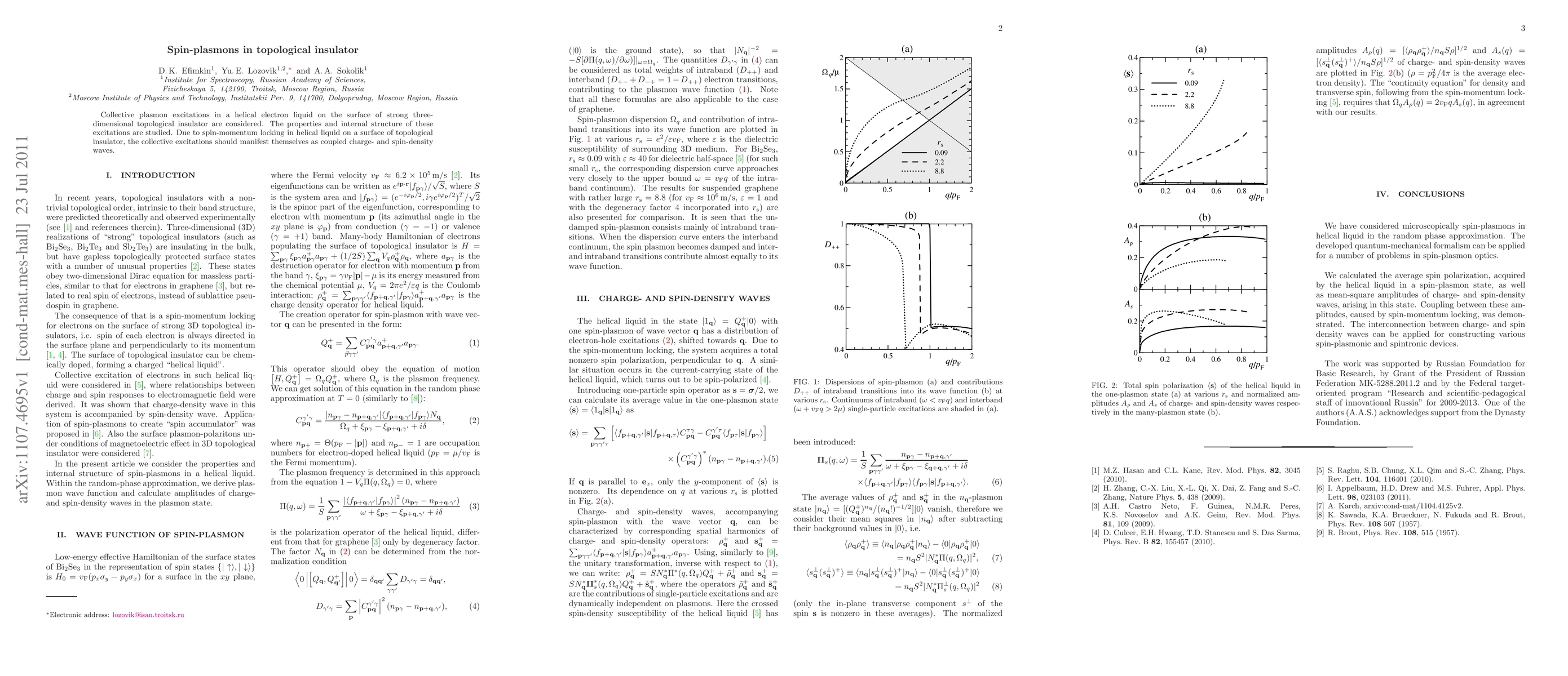 Summary: This paper explores spin-plasmons in the helical electron liquid on the surface of a strong three-dimensional topological insulator, revealing their coupled charge- and spin-density wave characteristics due to spin-momentum locking. The study provides insights into the internal structure and properties of these collective excitations.