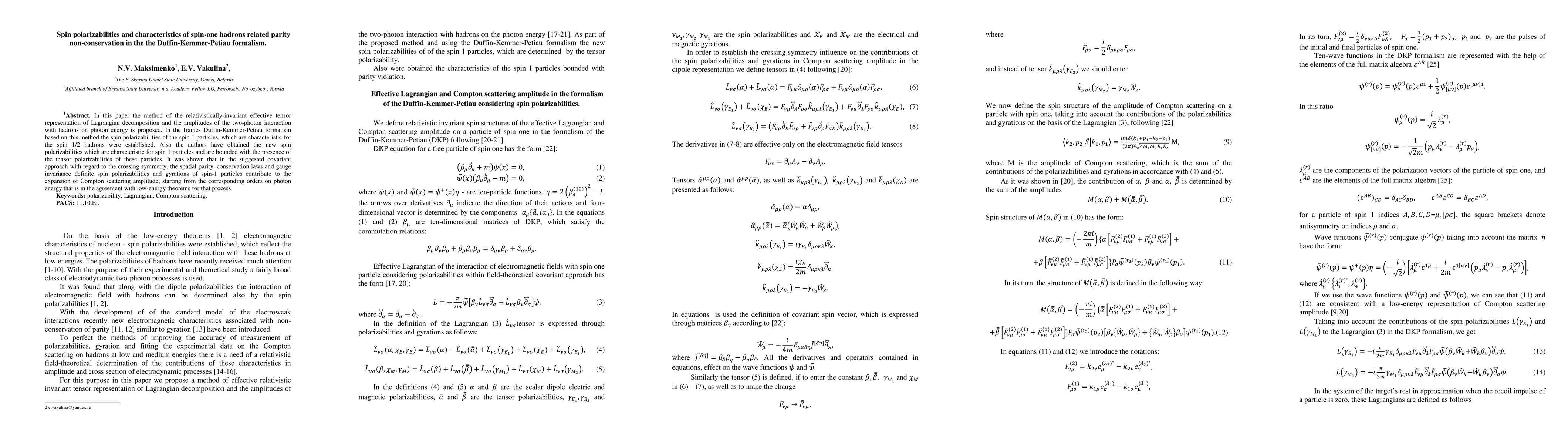 This paper explores the spin polarizabilities of spin-1 hadrons using the Duffin-Kemmer-Petiau formalism, establishing new characteristics linked to parity non-conservation. It proposes a relativistically-invariant method for two-photon interaction amplitudes, revealing contributions from spin polarizabilities to Compton scattering at low photon energies.
