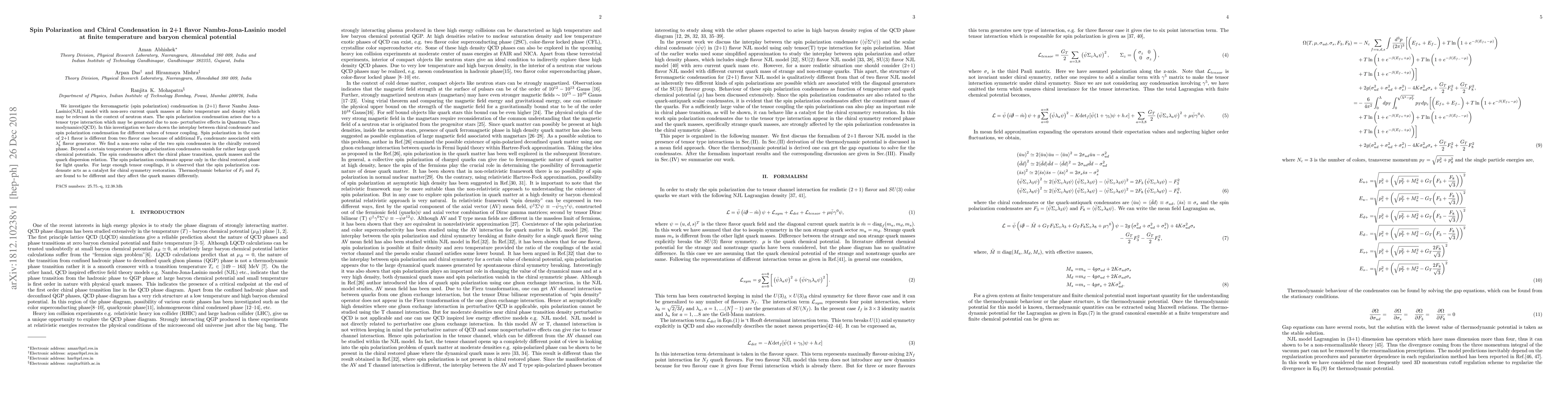 We investigate the ferromagnetic (spin polarization) condensation in (2+1) flavor Nambu Jona-Lasinio(NJL) model with non-zero current quark masses at finite temperature and density which may be relevant in the context of neutron stars. The spin polarization condensation arises due to a tensor type interaction which may be generated due to non-perturbative effects in Quantum Chromodynamics(QCD). In this investigation we have shown the interplay between chiral condensate and spin polarization condensation for different values of tensor coupling. Spin polarization in the case of 2+1 flavor is different from two flavor case because of additional F$_8$ condensate associated with $\lambda_8^f$ flavor generator. We find a non-zero value of the two spin condensates in the chirally restored phase. Beyond a certain temperature the spin polarization condensates vanish for rather large quark chemical potentials. The spin condensates affect the chiral phase transition, quark masses, and the quark dispersion relation. The spin polarization condensate appears only in the chiral restored phase for light quarks. For large enough tensor couplings, it is observed that the spin polarization condensate acts as a catalyst for chiral symmetry restoration. Thermodynamic behavior of $F_3$ and $F_8$ are found to be different and they affect the quark masses differently.