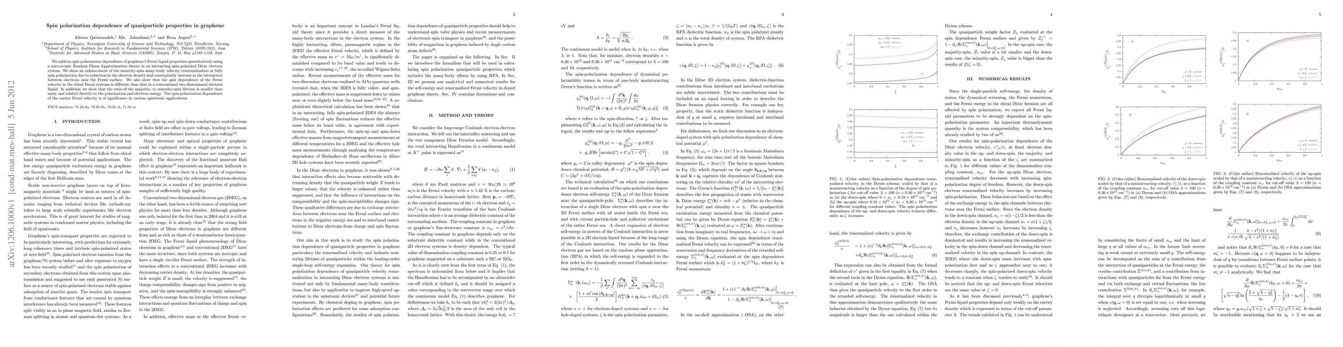 We address spin polarization dependence of graphene's Fermi liquid properties quantitatively using a microscopic Random Phase Approximation theory in an interacting spin-polarized Dirac electron system. We show an enhancement of the minority-spin many-body velocity renormalization at fully spin polarization due to reduction in the electron density and consequently increase in the interaction between electrons near the Fermi surface. We also show that the spin dependence of the Fermi velocity in the chiral Fermi systems is different than that in a conventional two-dimensional electron liquid. In addition, we show that the ratio of the majority- to minority-spin lifetime is smaller than unity and related directly to the polarization and electron energy. The spin-polarization dependence of the carrier Fermi velocity is of significance in various spintronic applications.