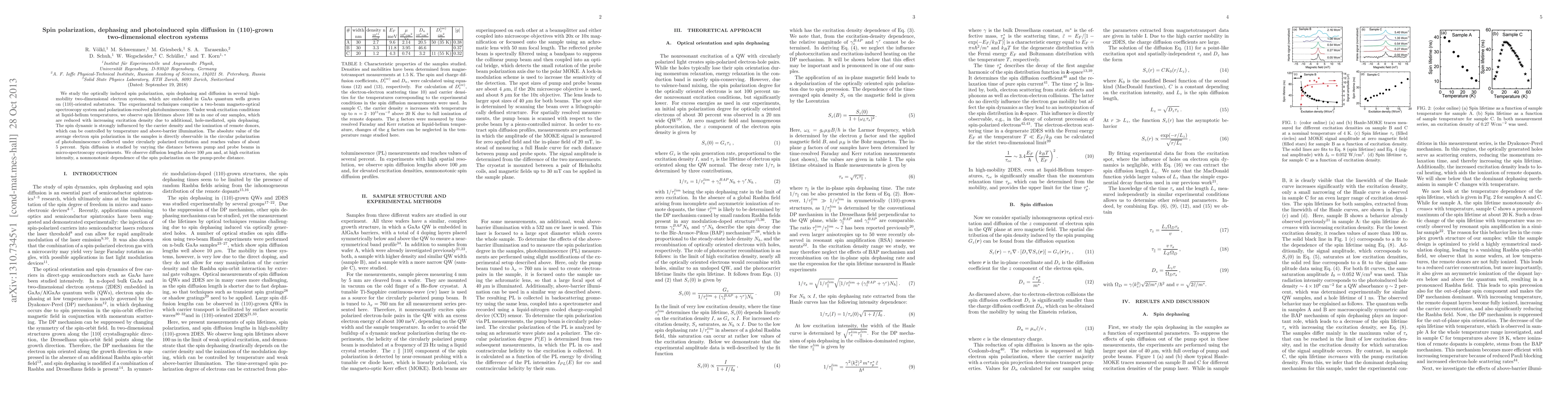 This paper investigates spin polarization, dephasing, and diffusion in (110)-oriented GaAs quantum wells using magneto-optical spectroscopy and photoluminescence. It finds long spin lifetimes and high spin polarization in certain samples, with spin dynamics influenced by carrier density and donor ionization.