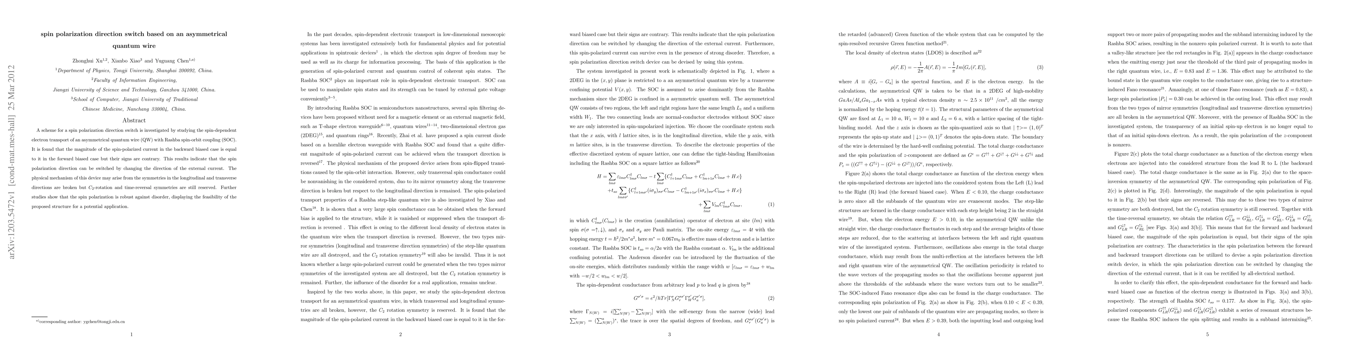 The research proposes a spin polarization direction switch using an asymmetrical quantum wire with Rashba spin-orbit coupling. The key finding is that the spin polarization direction can be reversed by altering the external current's direction, with the mechanism rooted in preserved $C_2$-rotation and time-reversal symmetries amid broken longitudinal and transverse symmetries. The study also highlights the structure's robustness against disorder, suggesting potential practical applications.