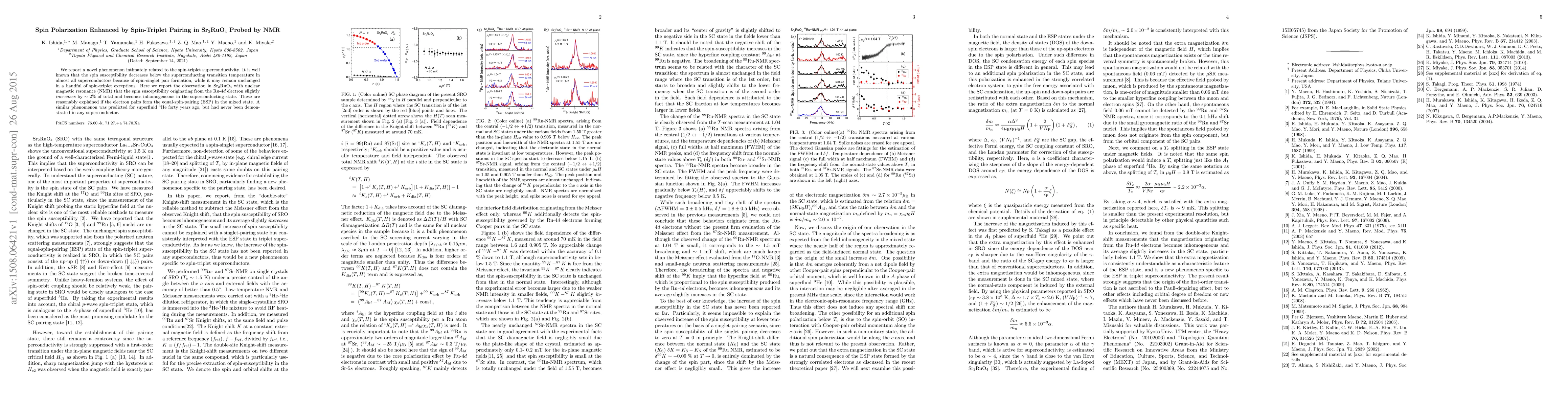 This paper reports an unusual increase in spin susceptibility in Sr$_2$RuO$_4$ below its superconducting transition temperature, detected via NMR, suggesting spin-triplet pairing and equal-spin-pairing (ESP) in the mixed state, a phenomenon previously predicted for superfluid $^3$He but never observed in superconductors.
