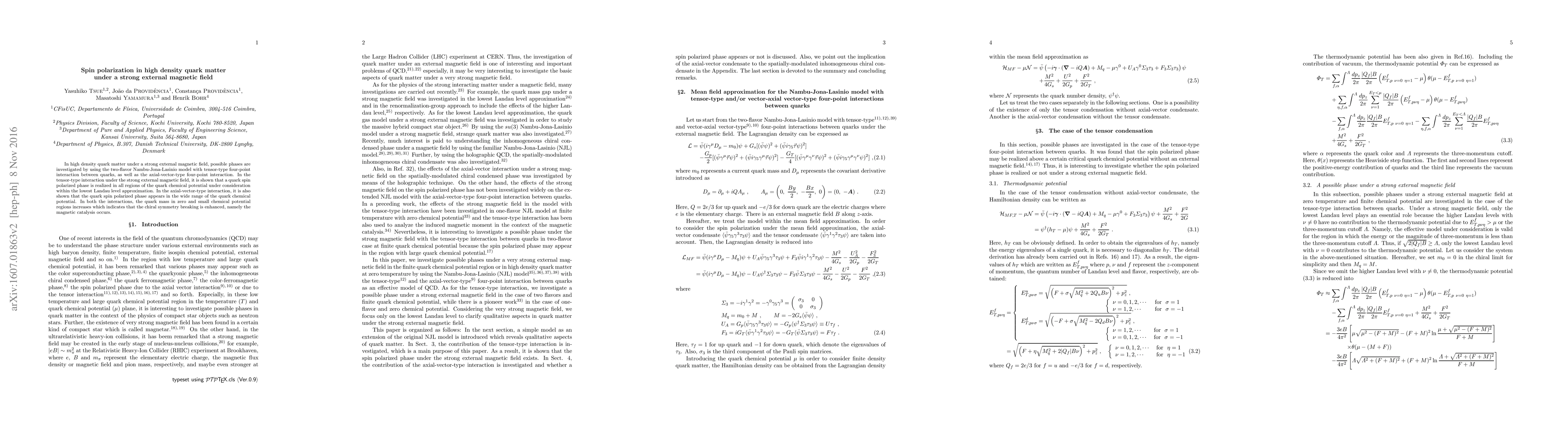 Summary: This paper investigates spin polarization in high-density quark matter under strong magnetic fields using the Nambu-Jona-Lasinio model. It finds that spin-polarized phases emerge under tensor-type and axial-vector-type interactions across a broad range of quark chemical potentials, with enhanced chiral symmetry breaking and magnetic catalysis observed in both cases.