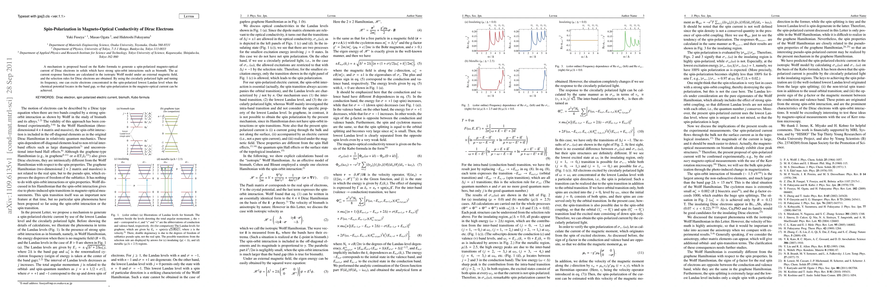 This paper proposes a mechanism using the Kubo formula to generate spin-polarized magneto-optical current in Dirac electrons with strong spin-orbit interactions. The study calculates ac current response functions in the Wolff model and demonstrates that tuning the frequency of circularly polarized light can excite spin-polarized electrons in the lowest Landau level, achieving spin-polarization in magneto-optical conductivity.