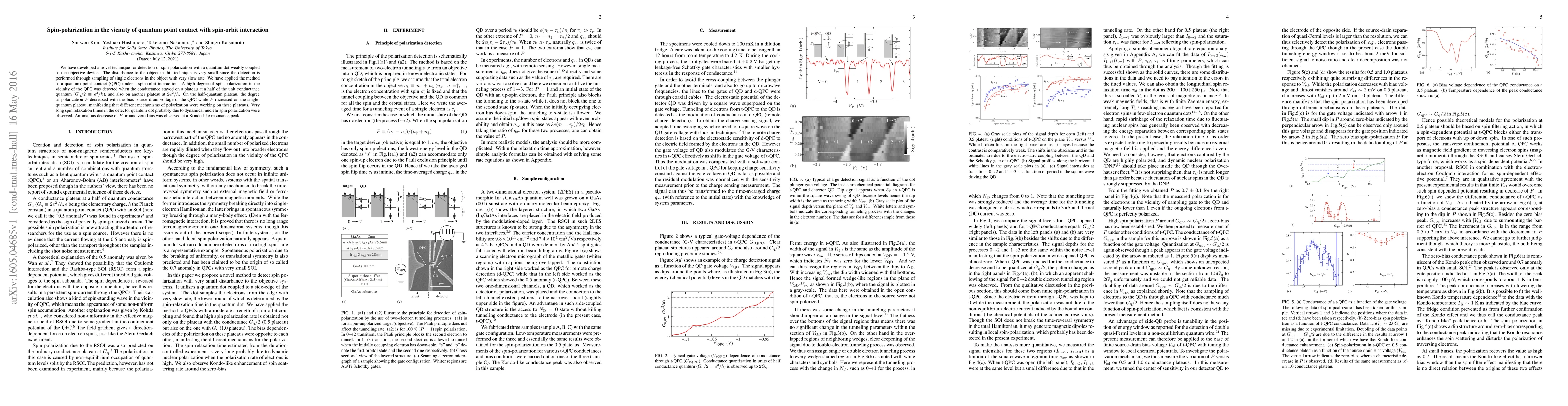 This research develops a minimal disturbance technique for detecting spin polarization in quantum point contacts (QPCs) under spin-orbit interaction, revealing high spin polarization at half-quantum and single-quantum conductance plateaus with distinct polarization mechanisms. Long spin relaxation times and anomalous polarization behavior near zero-bias were also observed.