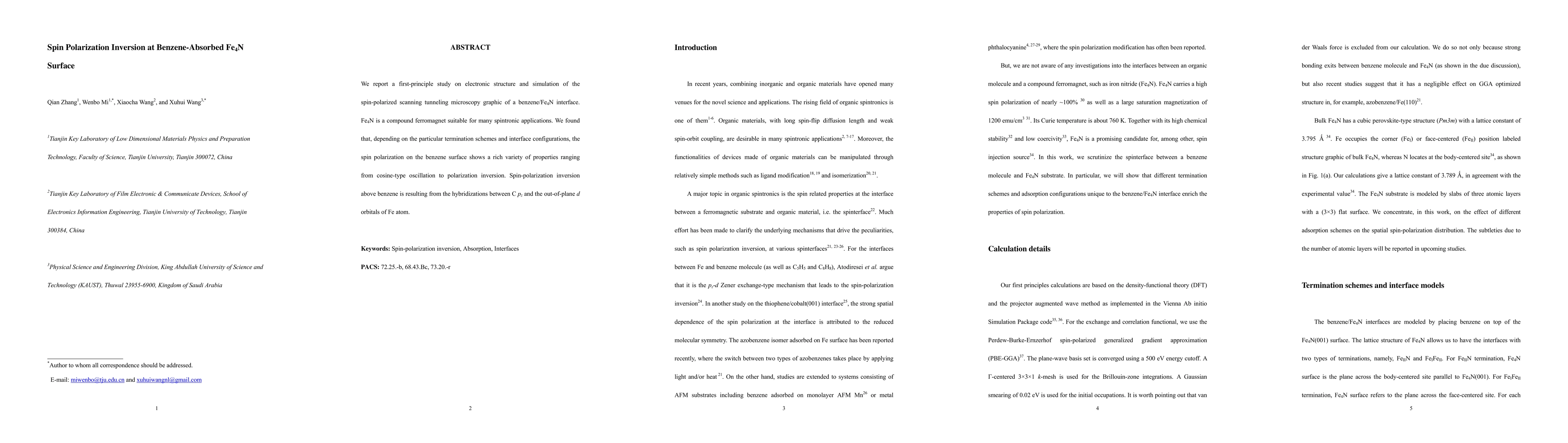 This study investigates the electronic structure and spin polarization at a benzene/Fe4N interface using first-principle calculations. It reveals diverse spin polarization behaviors, including inversion, due to hybridizations between benzene's C pz orbitals and Fe's out-of-plane d orbitals.