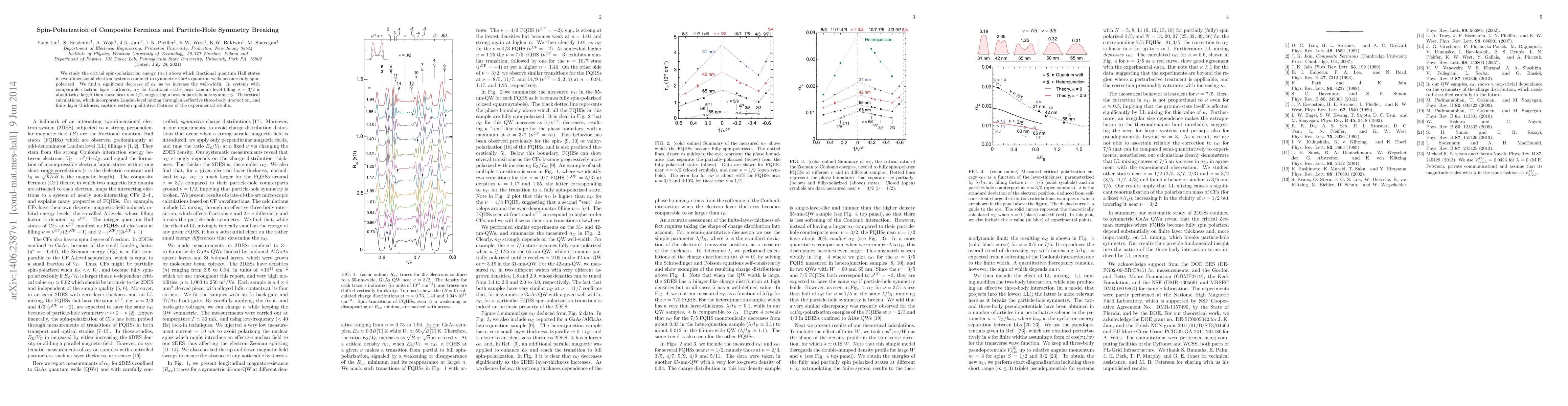 We study the critical spin-polarization energy ($\alpha_{\rm C}$) above which fractional quantum Hall states in two-dimensional electron systems confined to symmetric GaAs quantum wells become fully spin-polarized. We find a significant decrease of $\alpha_{\rm C}$ as we increase the well-width. In systems with comparable electron layer thickness, $\alpha_{\rm C}$ for fractional states near Landau level filling $\nu=3/2$ is about twice larger than those near $\nu=1/2$, suggesting a broken particle-hole symmetry. Theoretical calculations, which incorporate Landau level mixing through an effective three-body interaction, and finite layer thickness, capture certain qualitative features of the experimental results.