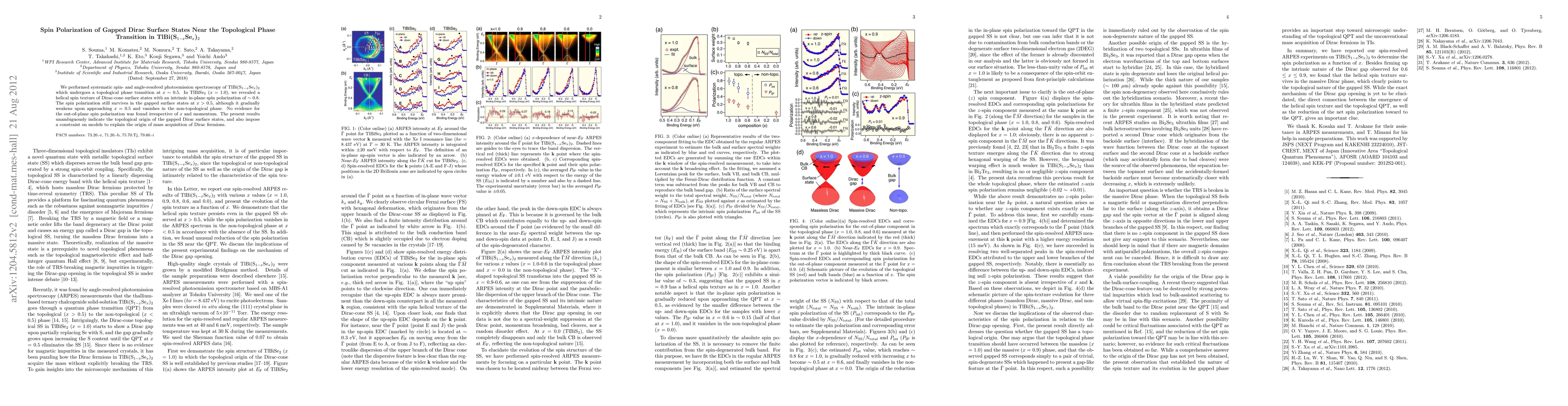 This study reveals the helical spin texture and intrinsic in-plane spin polarization of Dirac surface states in TlBi(S1-xSex)2, which persists in gapped states near the topological phase transition but diminishes as the transition is approached. The findings underscore the topological nature of these states and the absence of out-of-plane spin polarization.