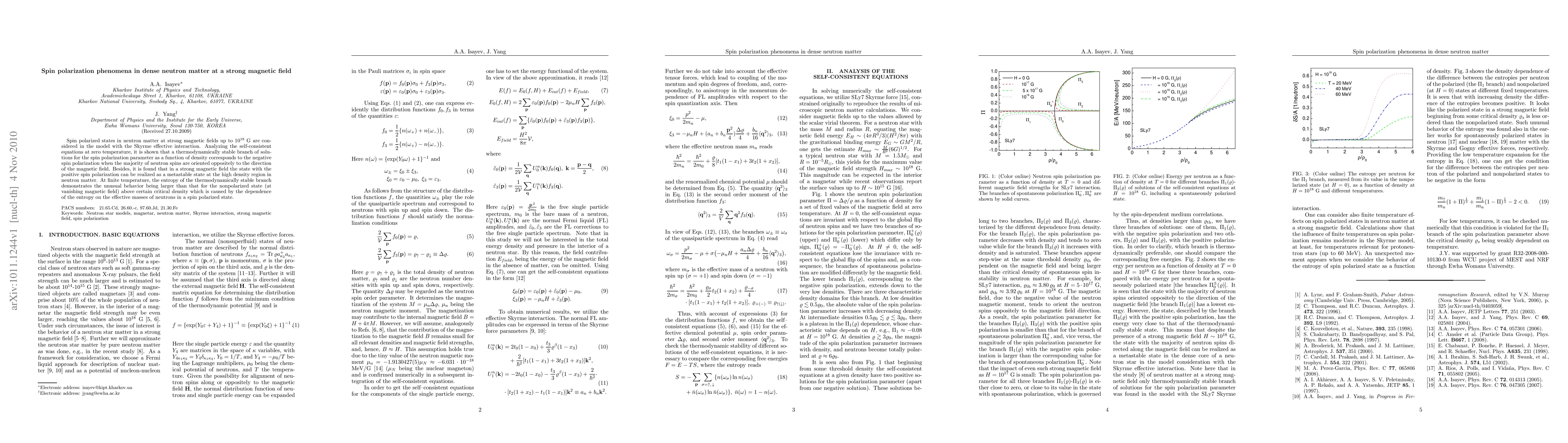 This paper investigates spin polarization in dense neutron matter under strong magnetic fields using the Skyrme effective interaction model. It finds that stable spin polarization occurs with majority neutron spins opposing the magnetic field, while a metastable state with positive spin polarization can exist at high densities. At finite temperatures, the entropy of the stable branch exceeds that of nonpolarized states above a critical density due to the effect on neutron effective masses.