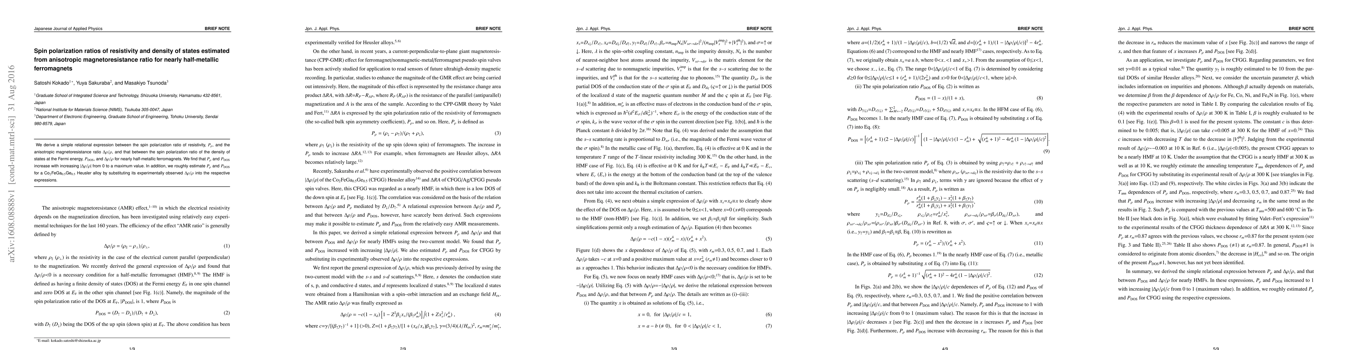 We derive a simple relational expression between the spin polarization ratio of resistivity, $P_\rho$, and the anisotropic magnetoresistance ratio $\Delta \rho/\rho$, and that between the spin polarization ratio of the density of states at the Fermi energy, $P_{\rm DOS}$, and $\Delta \rho/\rho$ for nearly half-metallic ferromagnets. We find that $P_\rho$ and $P_{\rm DOS}$ increase with increasing $|\Delta \rho/\rho|$ from 0 to a maximum value. In addition, we roughly estimate $P_\rho$ and $P_{\rm DOS}$ for a Co$_2$FeGa$_{0.5}$Ge$_{0.5}$ Heusler alloy by substituting its experimentally observed $\Delta \rho/\rho$ into the respective expressions.