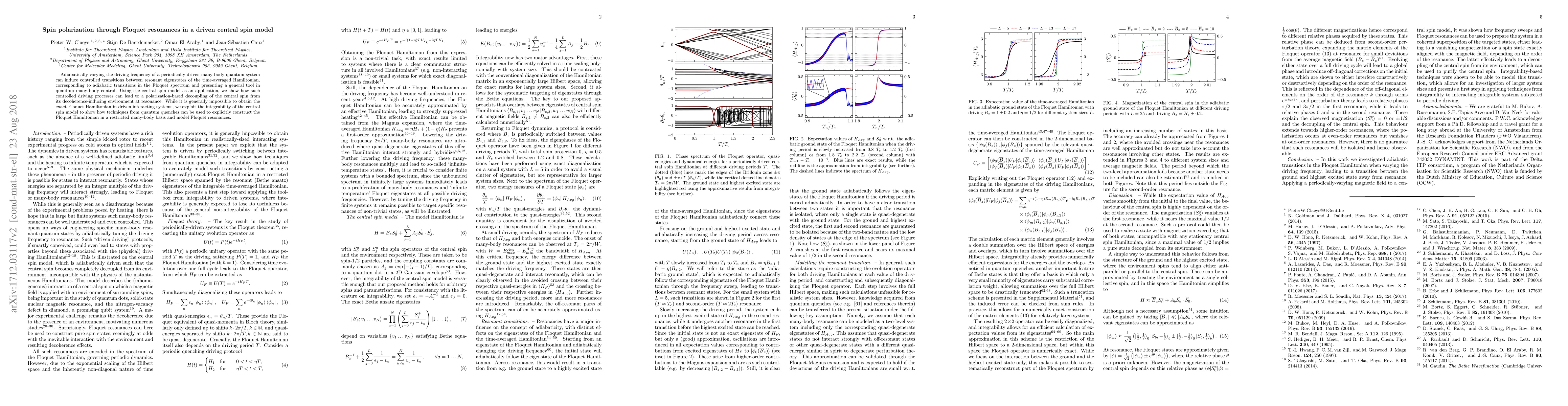 Adiabatically varying the driving frequency of a periodically-driven many-body quantum system can induce controlled transitions between resonant eigenstates of the time-averaged Hamiltonian, corresponding to adiabatic transitions in the Floquet spectrum and presenting a general tool in quantum many-body control. Using the central spin model as an application, we show how such controlled driving processes can lead to a polarization-based decoupling of the central spin from its decoherence-inducing environment at resonance. While it is generally impossible to obtain the exact Floquet Hamiltonian in driven interacting systems, we exploit the integrability of the central spin model to show how techniques from quantum quenches can be used to explicitly construct the Floquet Hamiltonian in a restricted many-body basis and model Floquet resonances.