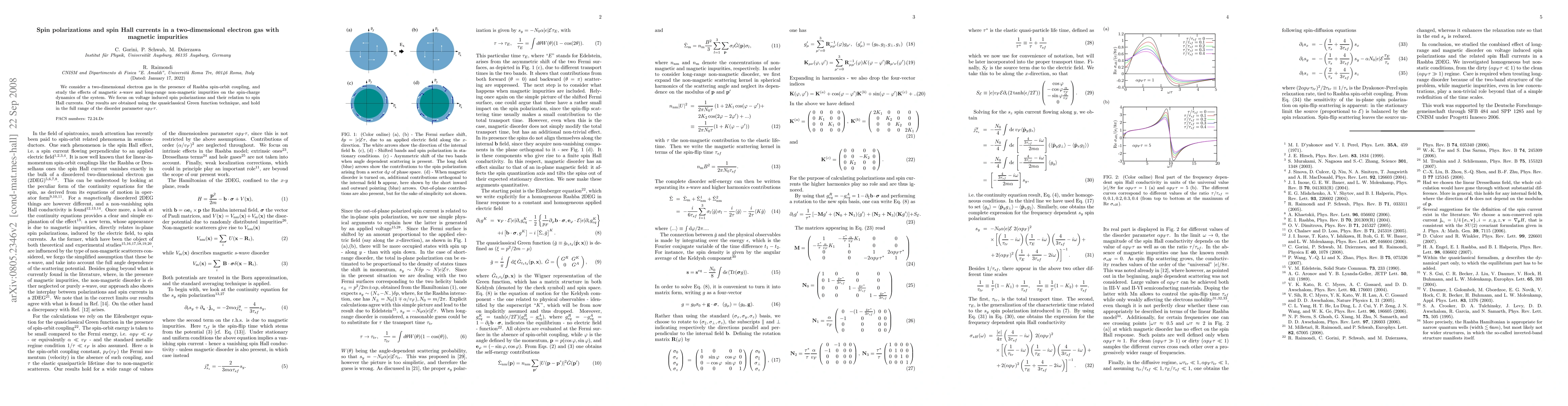 This paper investigates the spin polarizations and spin Hall currents in a two-dimensional electron gas with Rashba spin-orbit coupling, under the influence of magnetic impurities and long-range non-magnetic disorder. The study employs the quasiclassical Green function technique to analyze the effects on spin-charge dynamics.