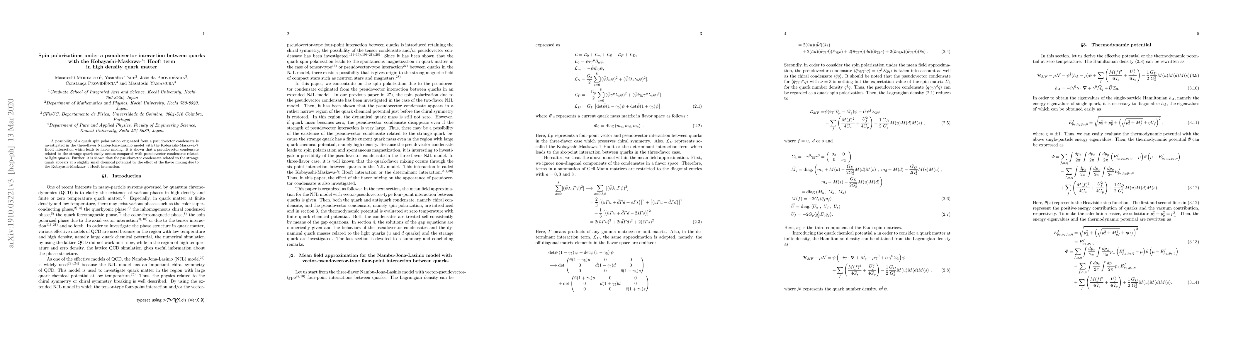 This paper investigates quark spin polarizations in high-density quark matter, finding that a pseudovector condensate related to the strange quark is more likely than one related to light quarks, facilitated by the Kobayashi-Maskawa-'t Hooft interaction. The pseudovector condensate for strange quarks emerges at a lower chemical potential due to flavor mixing effects.