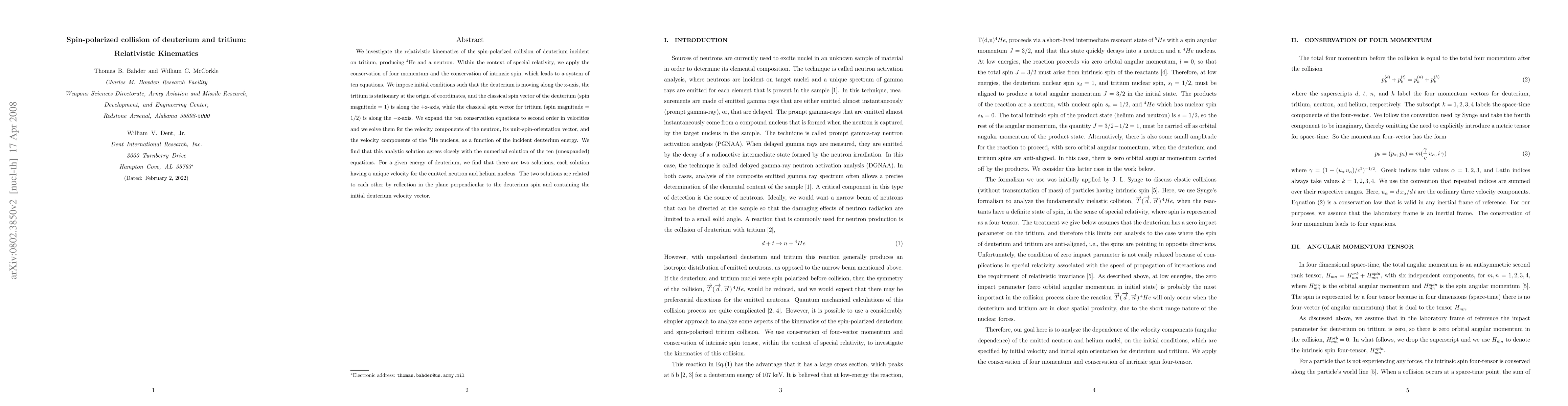 This paper investigates the relativistic kinematics of spin-polarized collisions between deuterium and tritium, deriving analytical solutions for the resulting neutron and helium-4 velocities using conservation laws and special relativity. It finds two distinct solutions for each incident deuterium energy, related by reflection in the plane perpendicular to the deuterium spin.