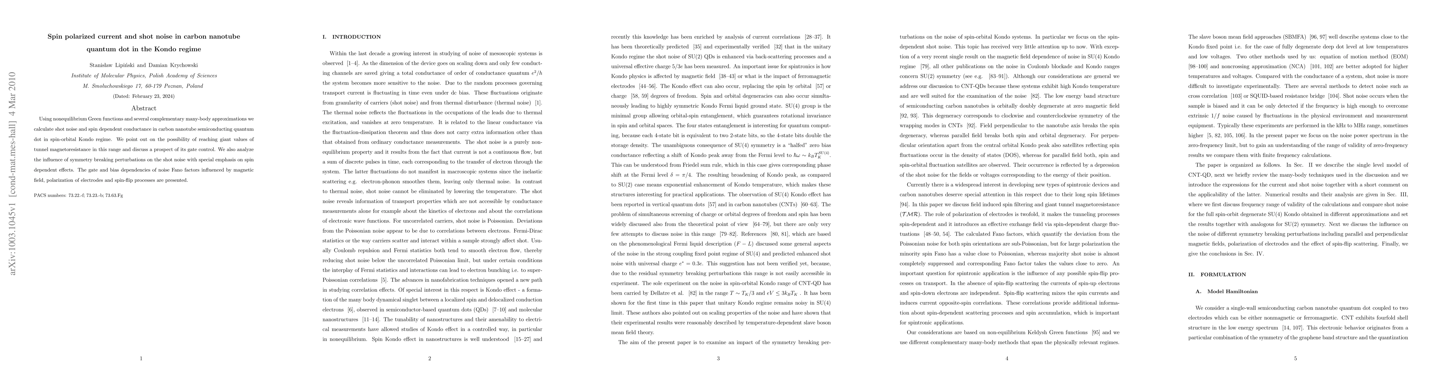 This paper investigates shot noise and spin-dependent conductance in a carbon nanotube quantum dot under spin-orbital Kondo regime, revealing potential for giant tunnel magnetoresistance and gate-controlled effects. It also explores how symmetry breaking perturbations affect shot noise, particularly through spin-dependent mechanisms.