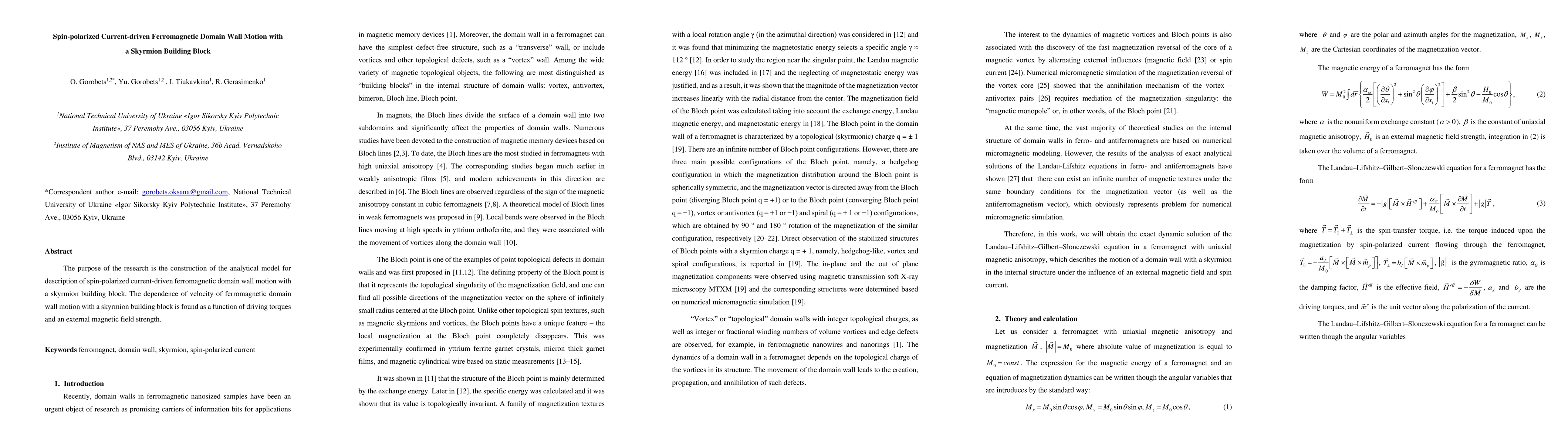 This research develops an analytical model to describe spin-polarized current-driven ferromagnetic domain wall motion utilizing a skyrmion building block. It determines how the domain wall velocity depends on driving torques and external magnetic field strength.