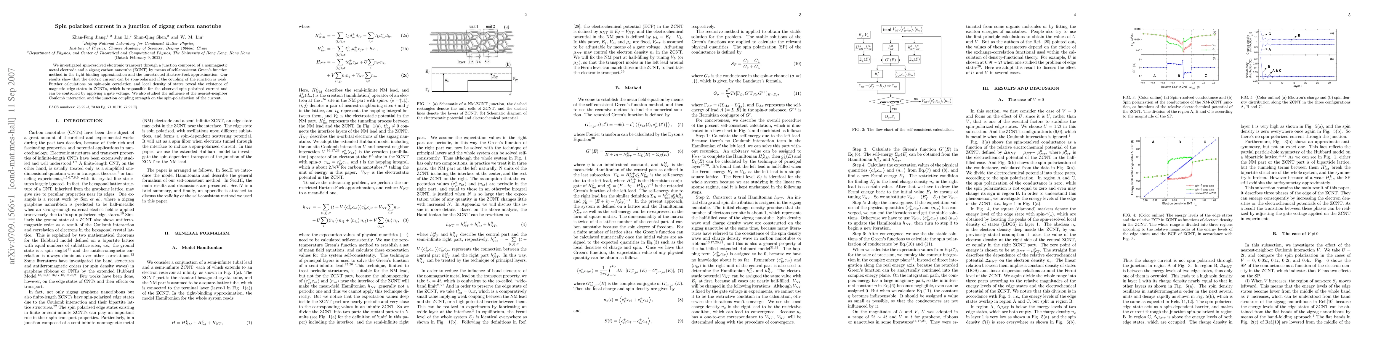 This study explores spin-polarized electronic transport in a junction of a nonmagnetic metal and a zigzag carbon nanotube, revealing that weak junction coupling induces spin-polarized current due to magnetic edge states. The spin-polarization can be modulated by gate voltage and is influenced by Coulomb interaction and junction coupling strength.