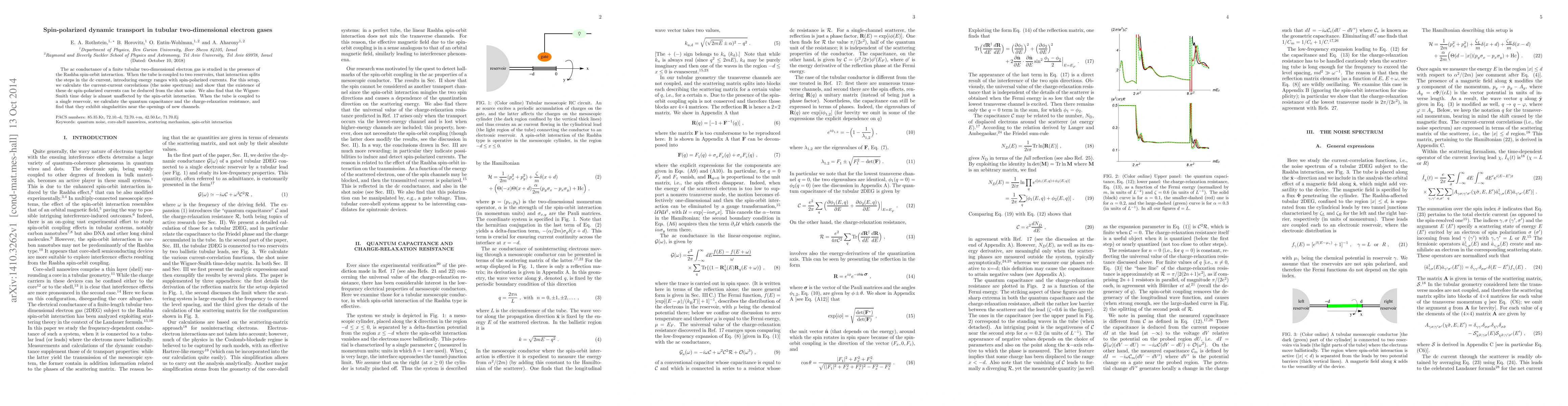 The ac conductance of a finite tubular two-dimensional electron gas is studied in the presence of the Rashba spin-orbit interaction. When the tube is coupled to two reservoirs, that interaction splits the steps in the dc current, introducing energy ranges with spin-polarized currents. For this setup, we calculate the current-current correlations (the noise spectrum) and show that the existence of these dc spin-polarized currents can be deduced from the shot noise. We also find that the Wigner-Smith time delay is almost unaffected by the spin-orbit interaction. When the tube is coupled to a single reservoir, we calculate the quantum capacitance and the charge-relaxation resistance, and find that they exhibit singularities near the openings of new channels.