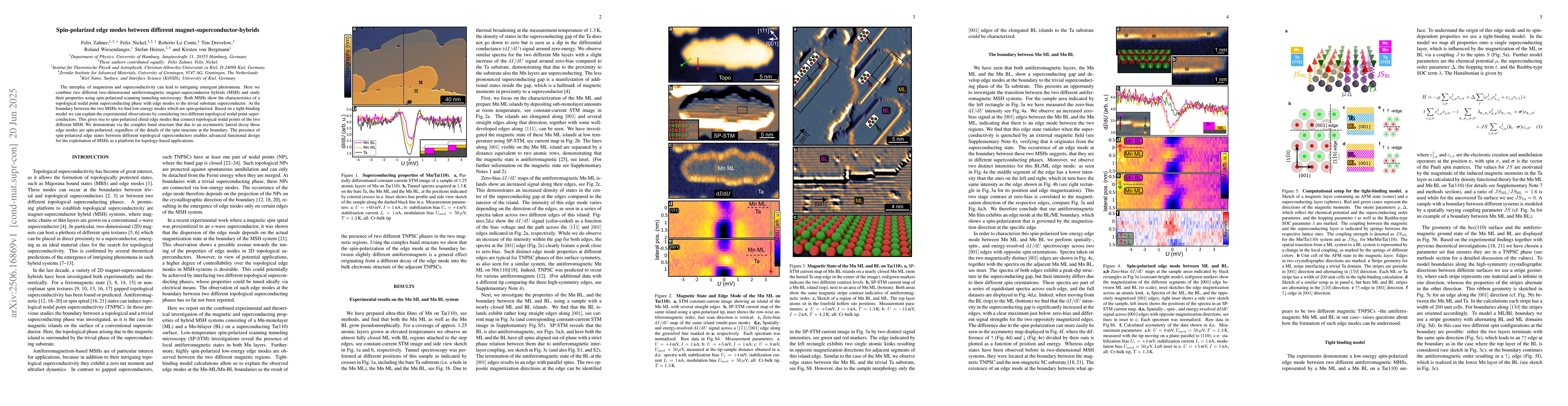The interplay of magnetism and superconductivity can lead to intriguing emergent phenomena. Here we combine two different two-dimensional antiferromagnetic magnet-superconductor hybrids (MSH) and study their properties using spin-polarized scanning tunneling microscopy. Both MSHs show the characteristics of a topological nodal point superconducting phase with edge modes to the trivial substrate superconductor. At the boundary between the two MSHs we find low-energy modes which are spin-polarized. Based on a tight-binding model we can explain the experimental observations by considering two different topological nodal point superconductors. This gives rise to spin-polarized chiral edge modes that connect topological nodal points of the two different MSH. We demonstrate via the complex band structure that due to an asymmetric lateral decay these edge modes are spin-polarized, regardless of the details of the spin structure at the boundary. The presence of spin-polarized edge states between different topological superconductors enables advanced functional design for the exploitation of MSHs as a platform for topology-based applications.