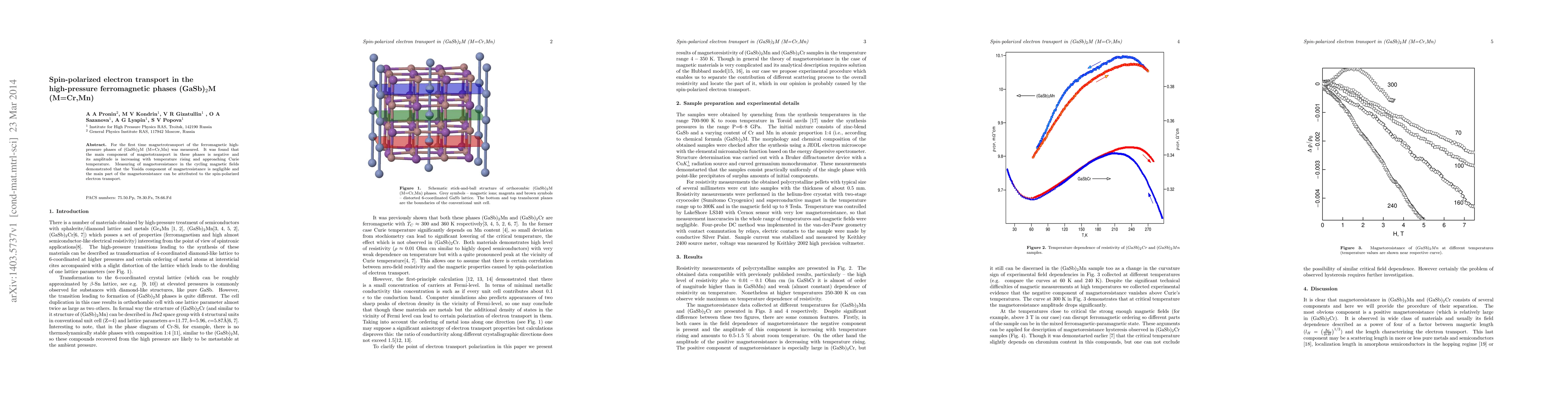 For the first time magnetrotransport of the ferromagnetic high-pressure phases of (GaSb)$_2$M (M=Cr,Mn) was measured. It was found that the main component of magnetotransport in these phases is negative and its amplitude is increasing with temperature rising and approaching Curie temperature. Measuring of magnetoresistance in the cycling magnetic fields demonstrated that the Yosida component of magnetresistance is negligible and the main part of the magnetoresistance can be attributed to the spin-polarized electron transport.
