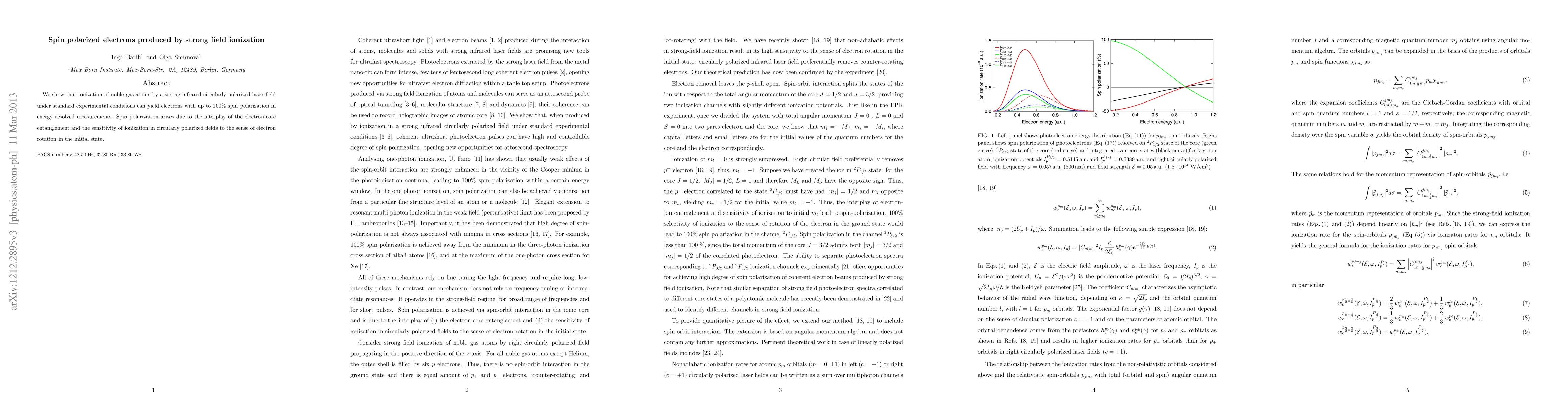 Summary: This study demonstrates that strong infrared circularly polarized laser fields can ionize noble gas atoms, producing electrons with up to 100% spin polarization, attributed to electron-core entanglement and ionization sensitivity to electron rotation in the initial state.