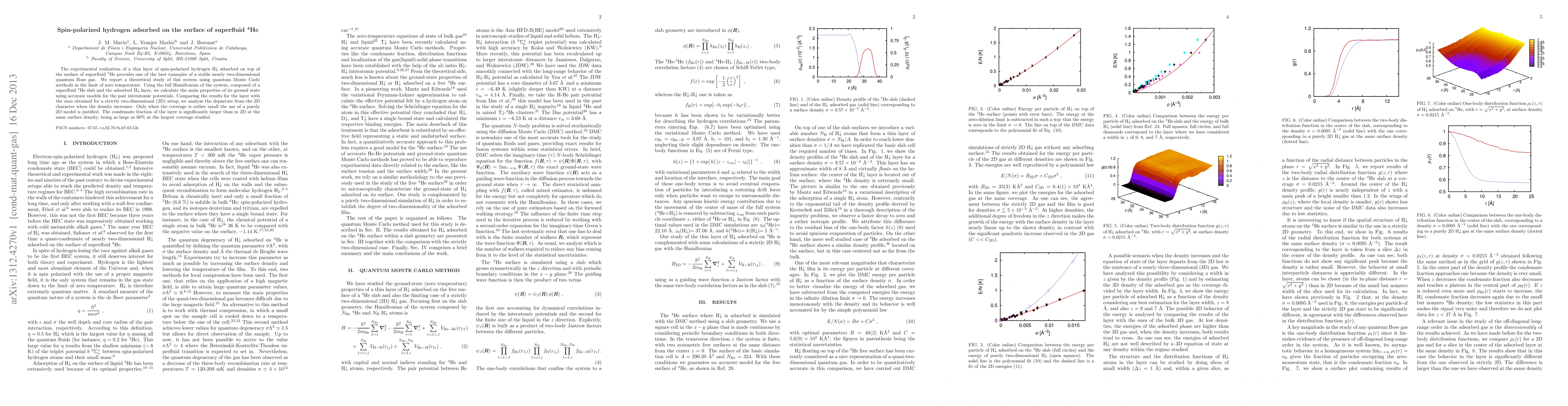 The experimental realization of a thin layer of spin-polarized hydrogen adsorbed on top of the surface of superfluid 4He provides one of the best examples of a stable nearly two-dimensional quantum Bose gas. We report a theoretical study of this system using quantum Monte Carlo methods in the limit of zero temperature. Using the full Hamiltonian of the system, composed of a superfluid 4He slab and the adsorbed hydrogen layer, we calculate the main properties of its ground state using accurate models for the pair interatomic potentials. Comparing the results for the layer with the ones obtained for a strictly two-dimensional (2D) setup, we analyze the departure from the 2D character when the density increases. Only when the coverage is rather small the use of a purely 2D model is justified. The condensate fraction of the layer is significantly larger than in 2D at the same surface density, being as large as $60\%$ at the largest coverage studied.