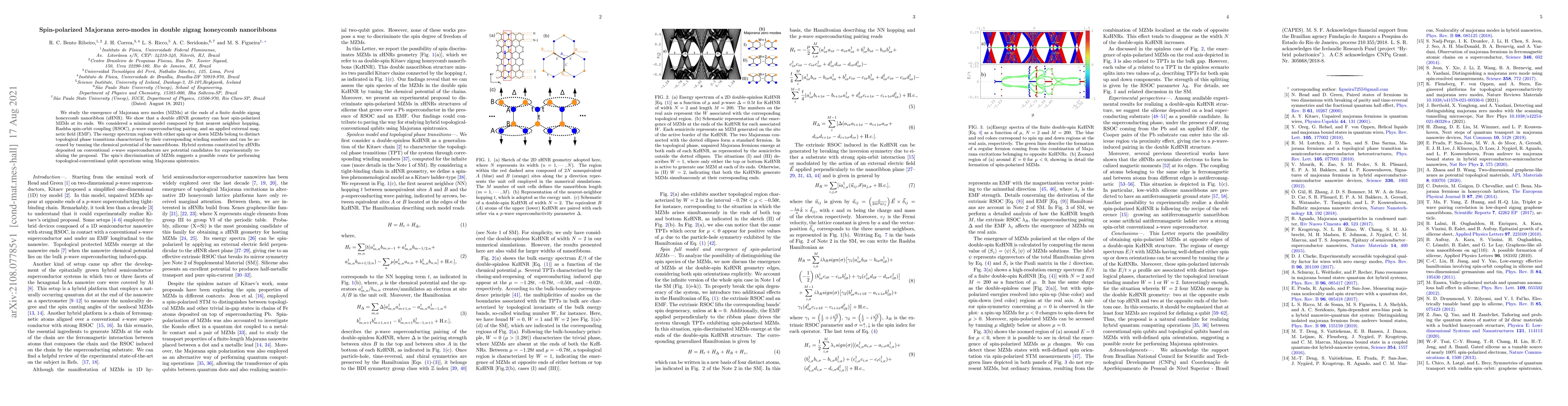 We study the emergence of Majorana zero modes (MZMs) at the ends of a finite double zigzag honeycomb nanoribbon (zHNR). We show that a double zHNR geometry can host spin-polarized MZMs at its ends. We considered a minimal model composed by first nearest neighbor hopping, Rashba spin-orbit coupling (RSOC), p-wave superconducting pairing, and an applied external magnetic field (EMF). The energy spectrum regions with either spin up or down MZMs belong to distinct topological phase transitions characterized by their corresponding winding numbers and can be accessed by tunning the chemical potential of the nanoribbons. Hybrid systems constituted by zHNRs deposited on conventional s-wave superconductors are potential candidates for experimentally realizing the proposal. The spin's discrimination of MZMs suggests a possible route for performing topological-conventional qubit operations using Majorana spintronics.