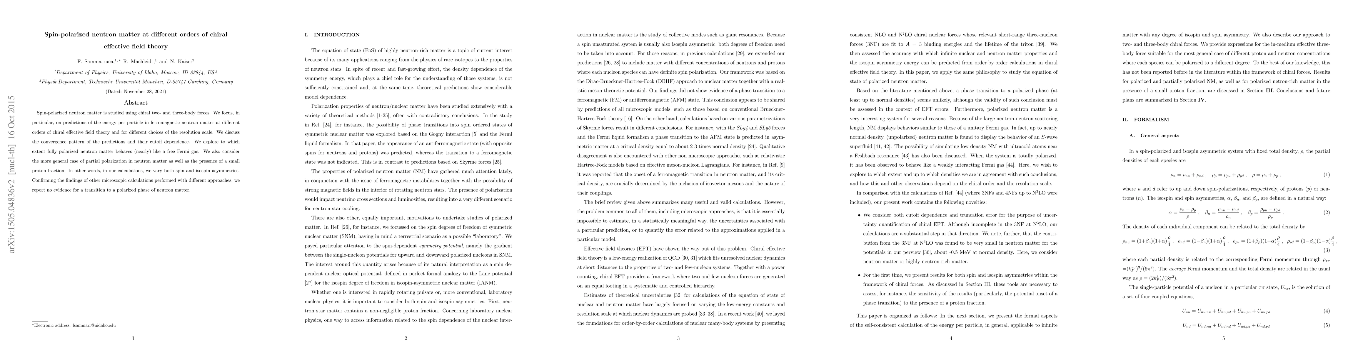 This paper explores spin-polarized neutron matter using chiral effective field theory, focusing on energy predictions at various orders and resolution scales. It finds no evidence for a transition to a polarized phase and discusses the behavior of fully polarized neutron matter as a free Fermi gas.