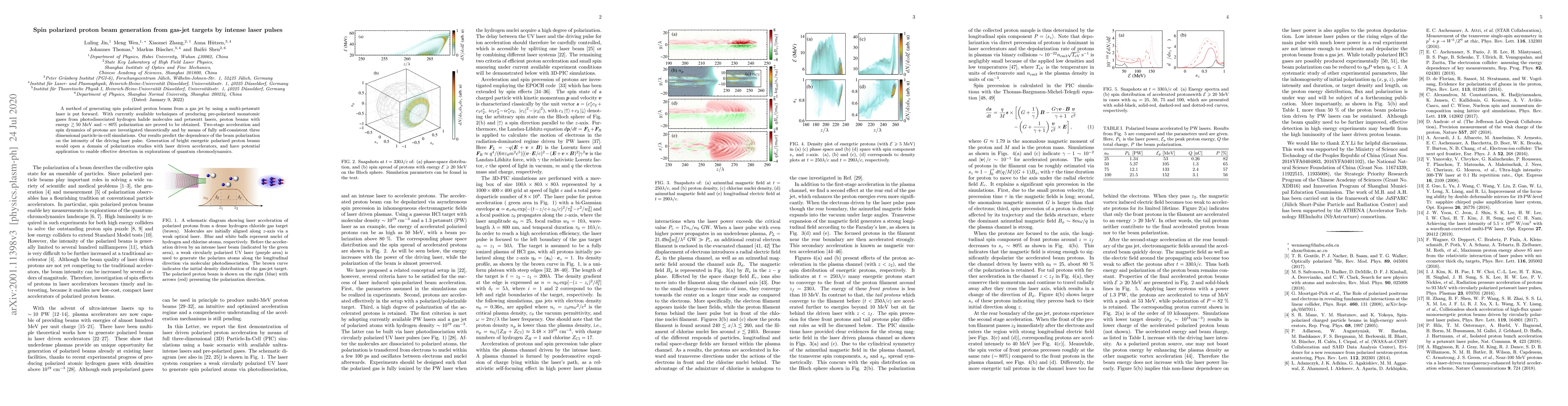 This paper proposes a method to generate spin-polarized proton beams from gas jets using intense multi-petawatt laser pulses, achieving ~50 MeV energy and ~80% polarization. Theoretical and simulation studies explore the two-stage acceleration and spin dynamics, predicting polarization dependence on laser intensity.