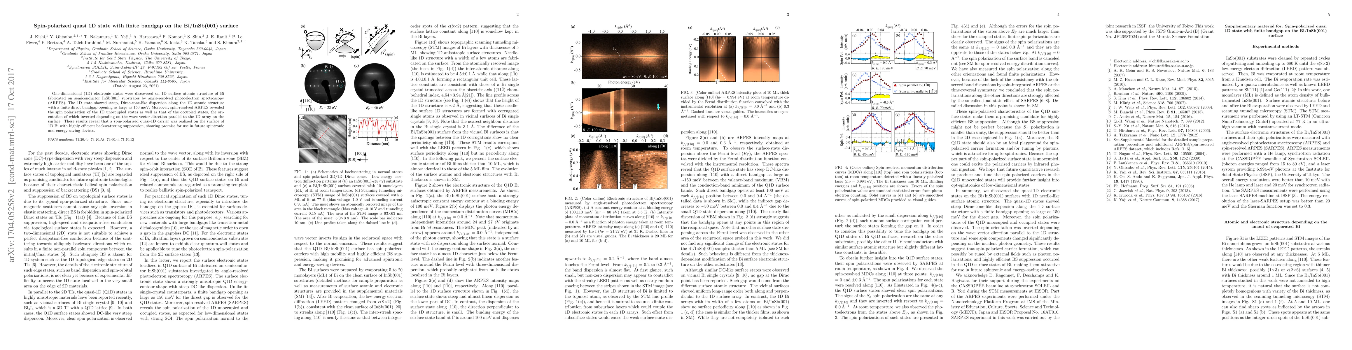 This paper reports the discovery of spin-polarized quasi-1D electronic states on a Bi/InSb(001) surface, characterized by a Dirac-cone-like dispersion and a finite bandgap of 150 meV. Spin-resolved ARPES reveals spin polarization in both occupied and unoccupied states, with orientation inversion based on wave vector direction, indicating potential for spintronic applications.