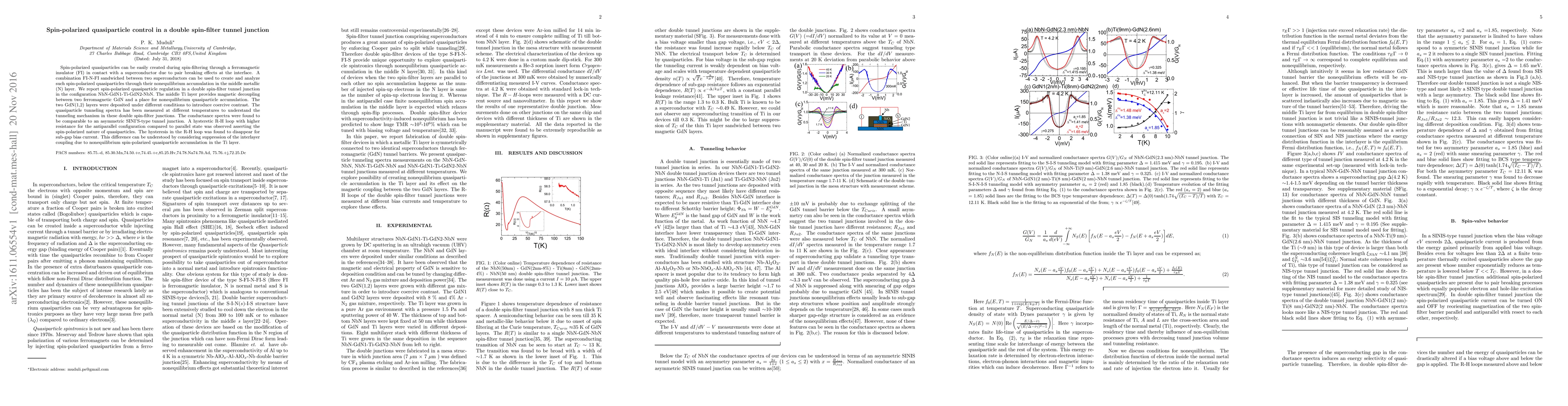 This paper investigates spin-polarized quasiparticle control in a double spin-filter tunnel junction using NbN-GdN1-Ti-GdN2-NbN configuration, revealing quasiparticle regulation and nonequilibrium accumulation in the Ti layer. The study shows hysteretic behavior indicative of spin-polarized quasiparticles, which diminishes under sub-gap bias current due to suppressed interlayer coupling.