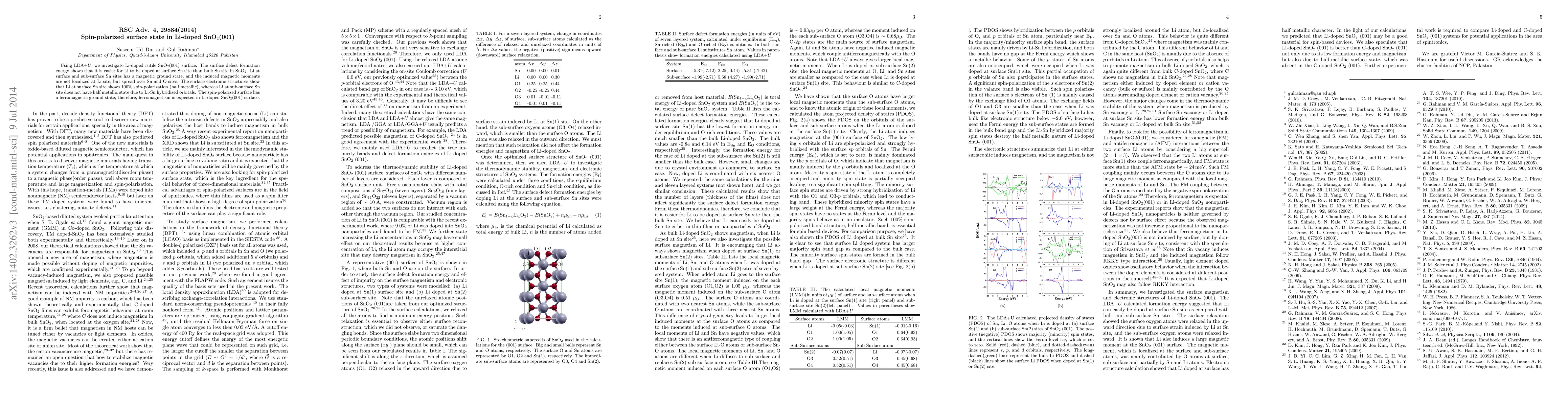 Using LDA+$U$, we investigate Li-doped rutile SnO$_2$(001) surface. The surface defect formation energy shows that it is easier for Li to be doped at surface Sn site than bulk Sn site in SnO$_2$. Li at surface and sub-surface Sn sites has a magnetic ground state, and the induced magnetic moments are not localized at Li site, but spread over Sn and O sites. The surface electronic structures show that Li at surface Sn site shows $100%$ spin-polarization (half metallic), whereas Li at sub-surface Sn site does not have half metallic state due to Li-Sn hybridized orbitals. The spin-polarized surface has a ferromagnetic ground state, therefore, ferromagnetism is expected in Li-doped SnO$_2$(001) surface.